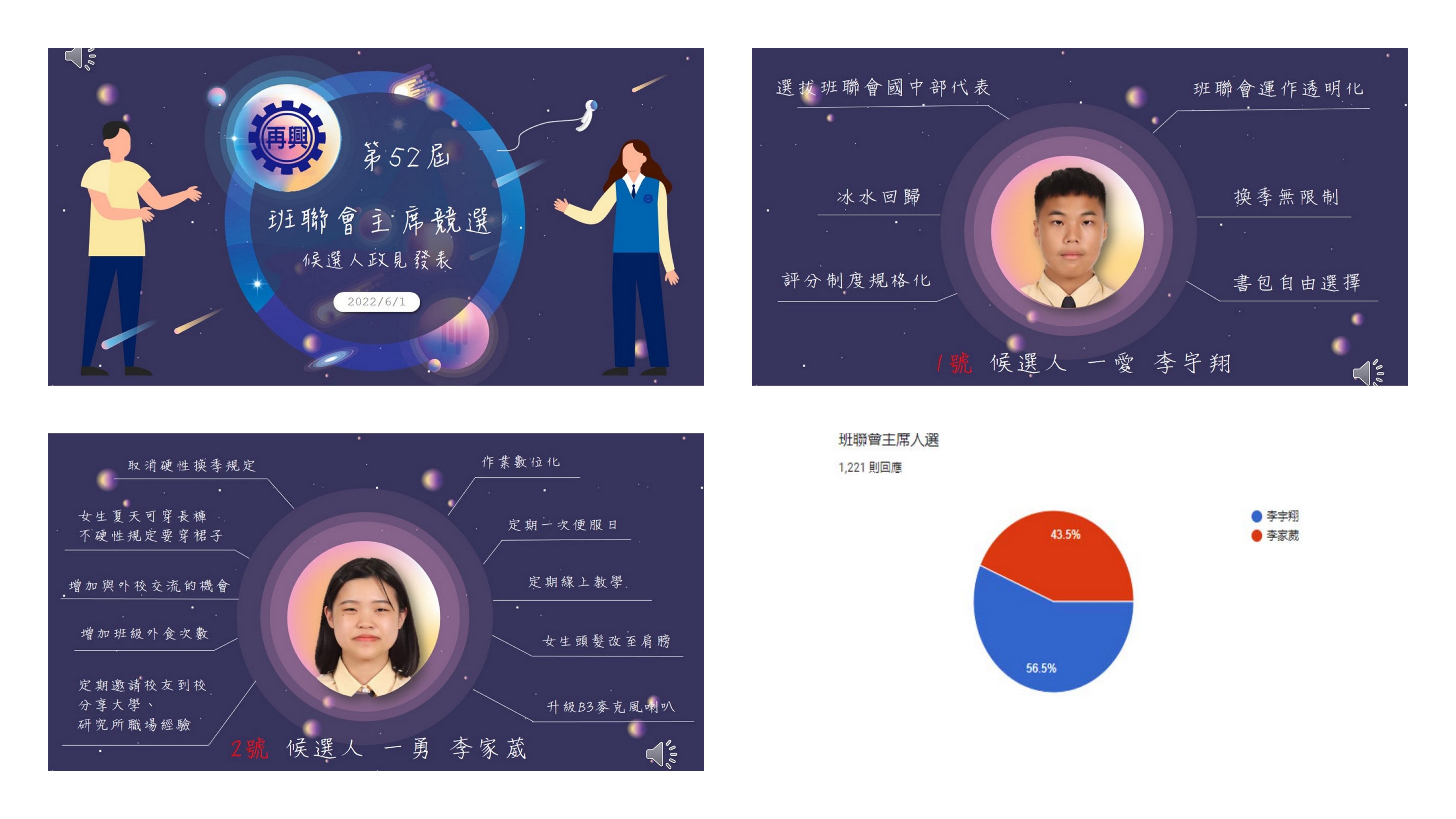 政見發表於6月1日週會課各班撥放後即可於Google表單進行投票,投票於6月1日18:00截止;最後由高一愛班1號候選人李宇翔同學當選本校高中部111學年度第52屆班聯會主席、2號候選人李家葳同學為副主席。