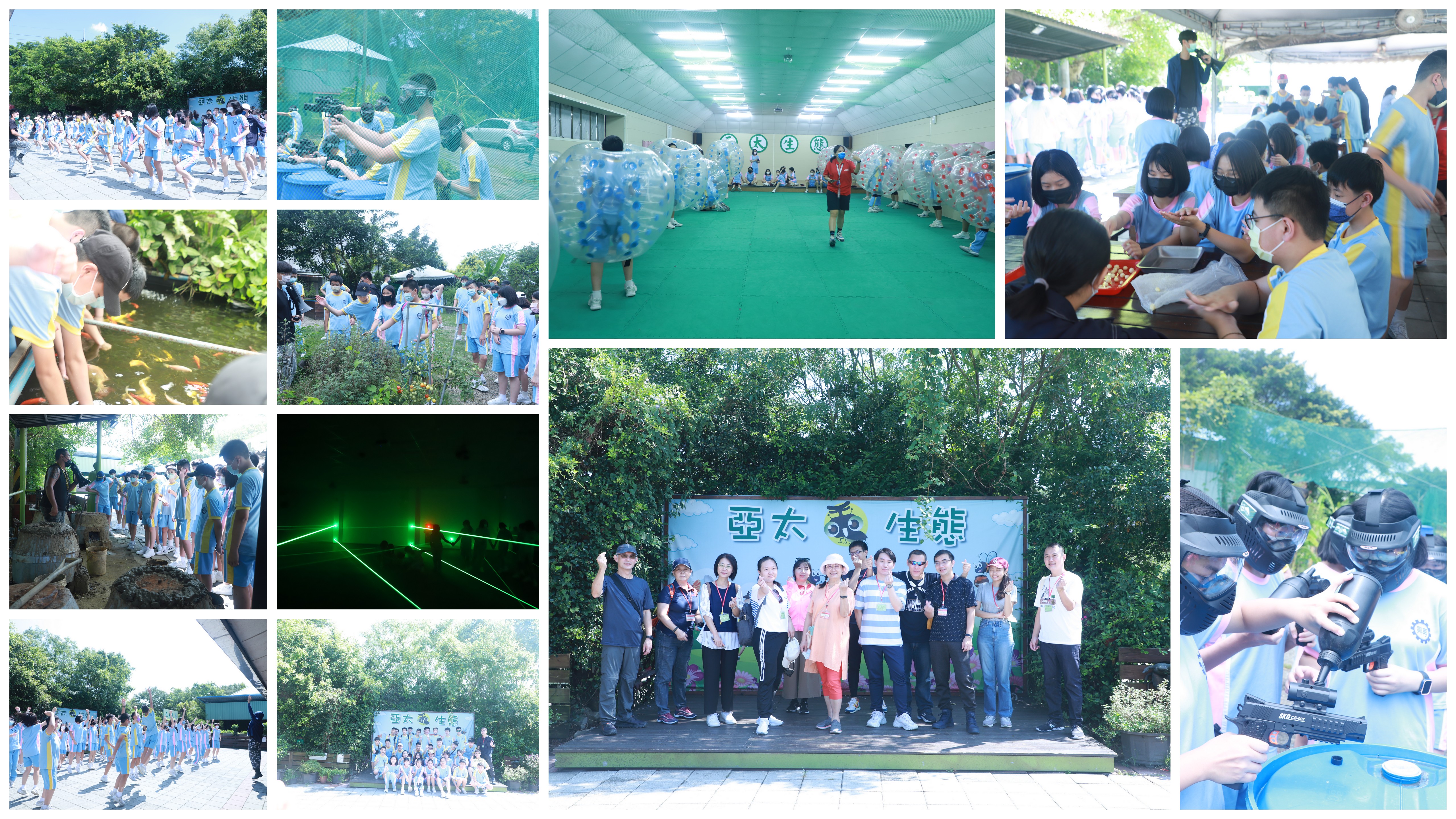 本日體驗活動豐富多元,學生在親手包裝控窯雞腿後,輪流由解說員帶領進行香草植栽、魚菜共生、甲蟲生態等自然導覽,並在教練的專業解說及風趣引導下,陸續完成趣味十足的鐳射迷宮、泡泡足球、軟彈槍對戰等體驗活動;最後以孩子們DIY的地瓜圓甜湯,為歡樂的一天畫上甜蜜的句點。所有人員於16:40平安返回校園。