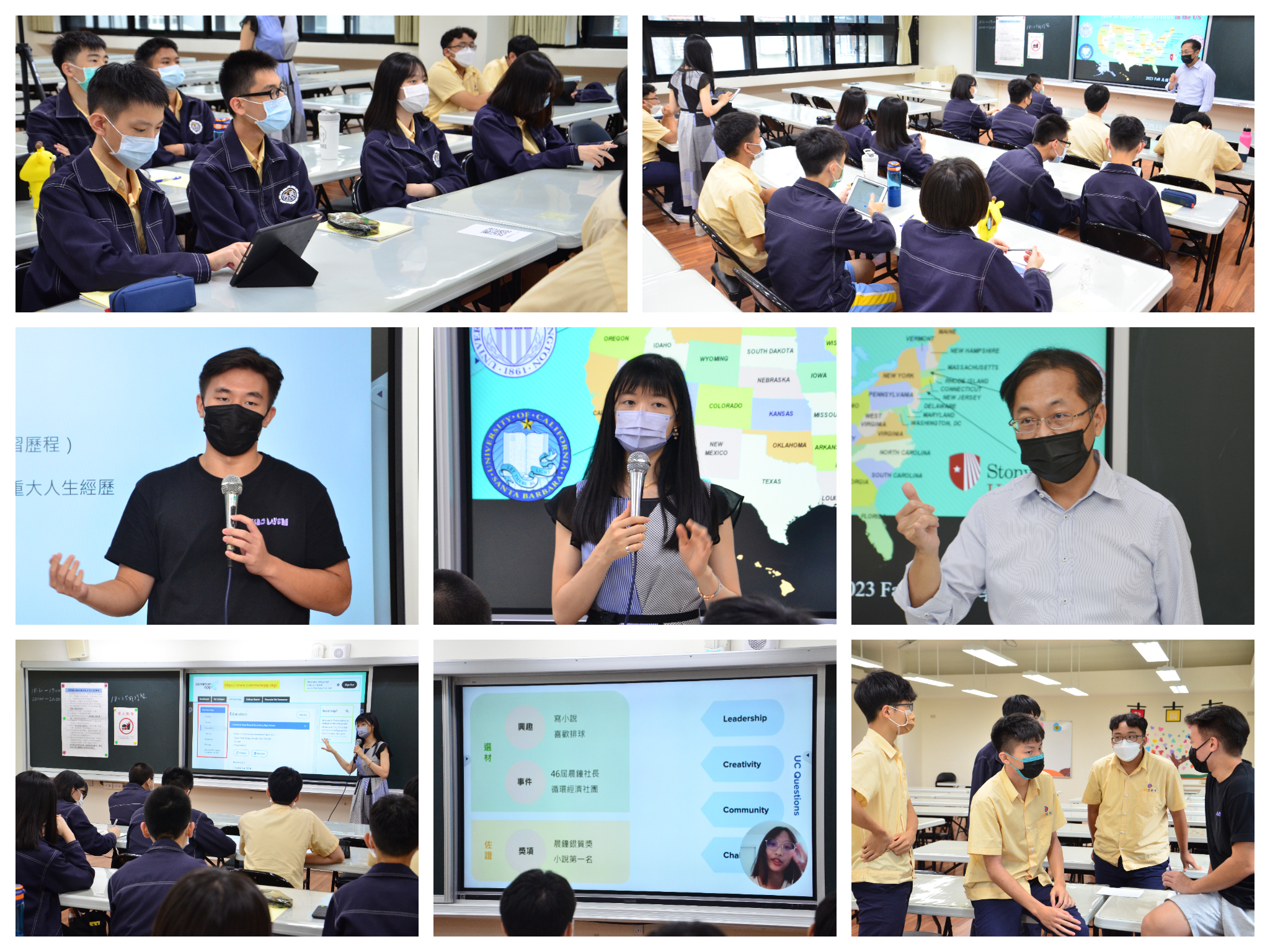 為協助申請美國大學的高三學生,了解申請流程及資料填寫事宜,本校於8月4日舉辦高三留美申請說明會,向學生解說美國大學申請注意事項,提醒學生留意資料繳交時程,並介紹與本校合作的四所美國大學之申請要求,包含紐約州立大學石溪分校、華盛頓大學西雅圖分校、加州大學聖塔芭芭拉分校及波士頓大學,希望透過這場說明會,輔導學生如期完成申請,順利錄取理想校系。