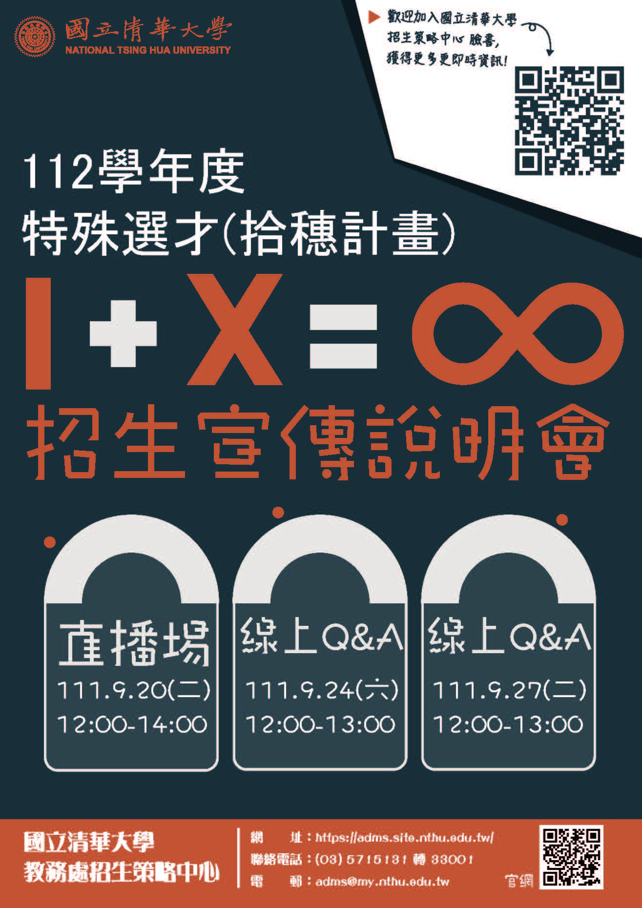 3、線上Q&A將採臉書直播方式進行,請於活動開始前至招生策略中心臉書粉絲團點選連結,亦會同步公告連結於國立清華大學招生專區。