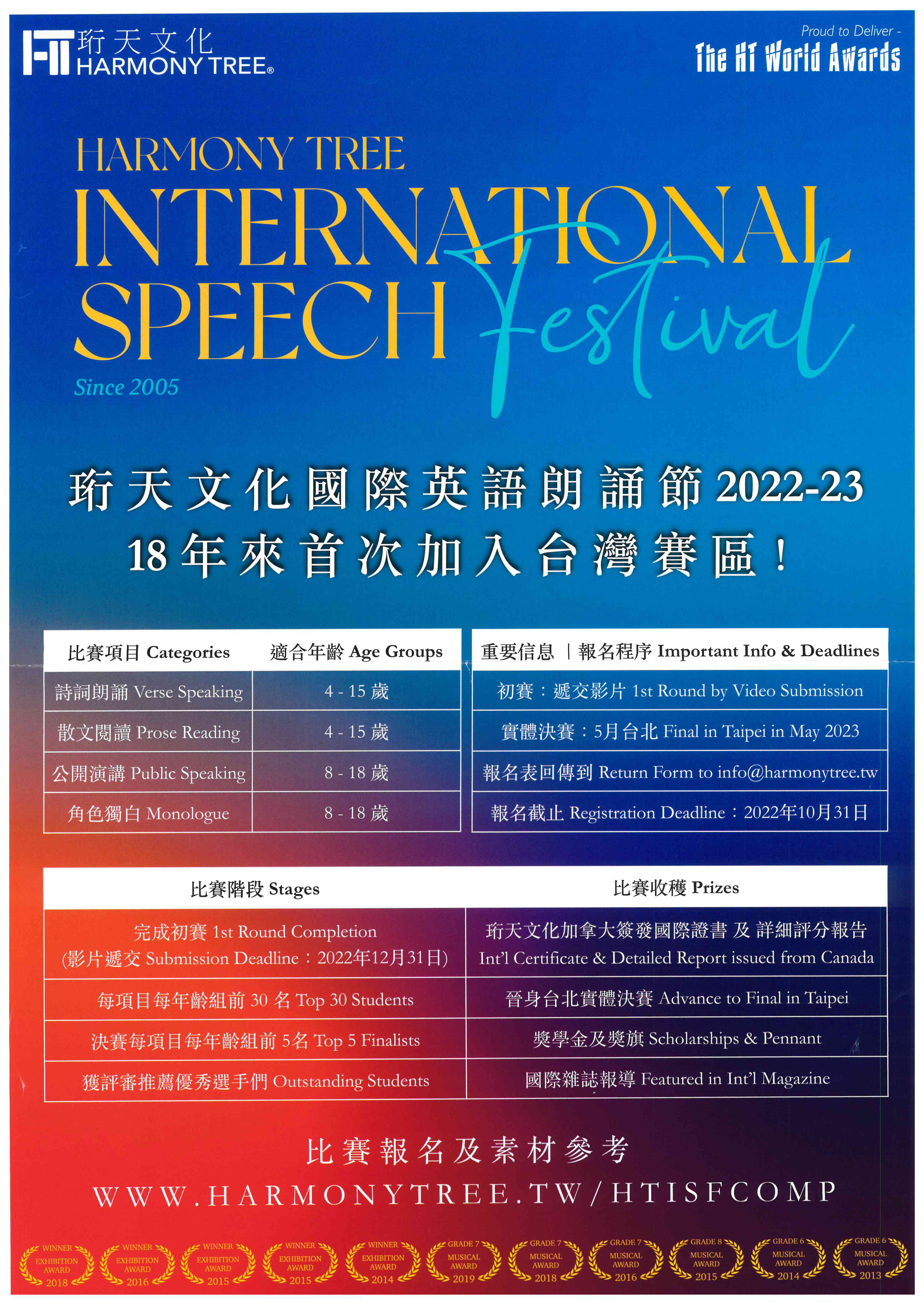 珩天文化國際英語朗誦節 (Harmony Tree International Speech Festival) 是一項由珩天加拿大總部主辦的國際大賽,旨在增厚學生的藝文素養、進一步提高溝通能力、建立信心,激發創造力。踏入第18年,HT 朗誦節終於來到台灣賽區!配合108課綱的政策和發展下,立即把握這個點亮個人簡歷,培育青年的寶貴機會,挑戰自己的同時,收獲國際證書!