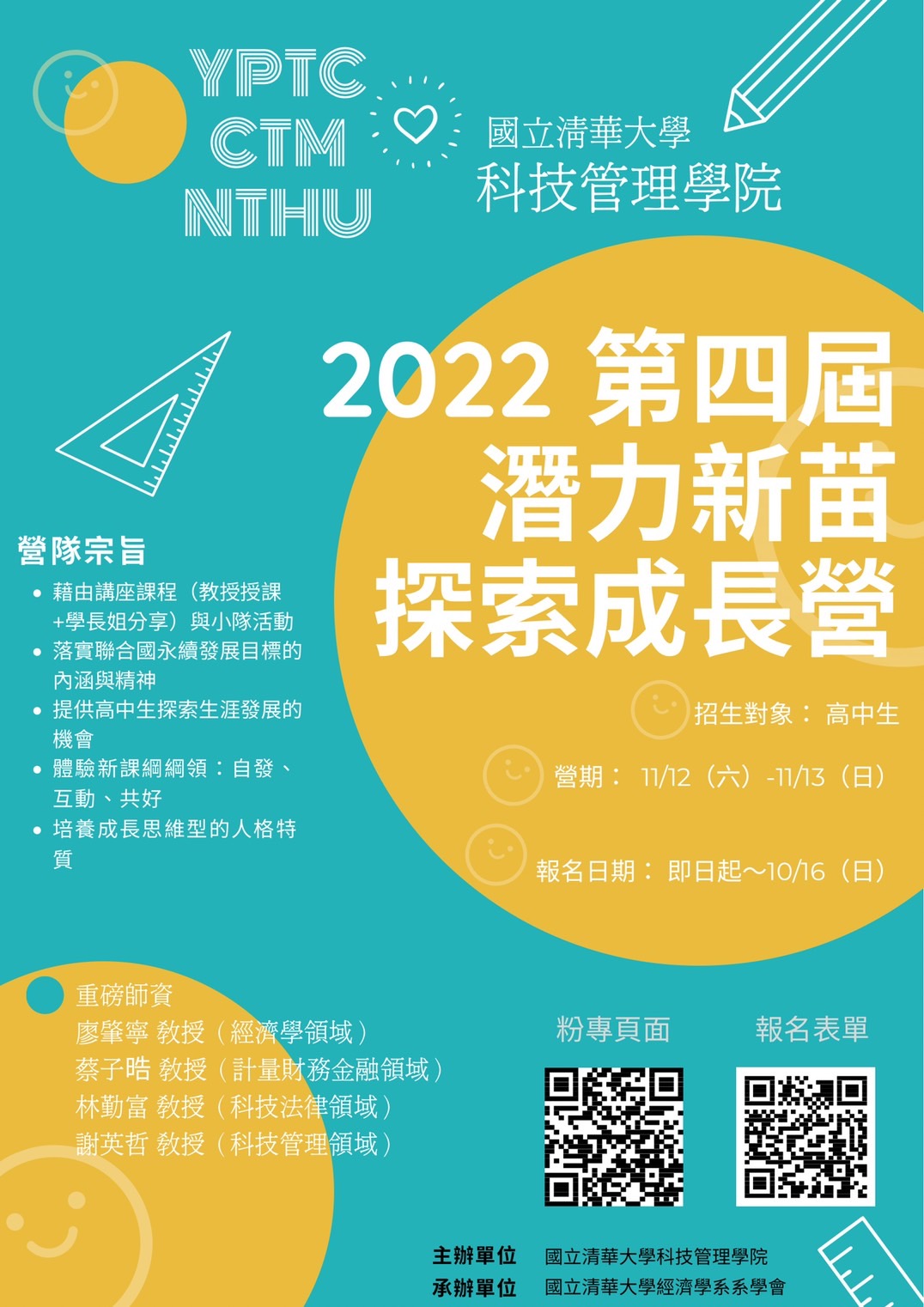國立清華大學科技管理學院將於111年11月12日~11月13日舉辦第四屆潛力新苗探索成長營,