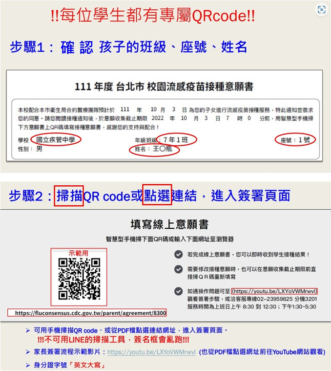 二、因應北市推行校園流感疫苗電子化系統(CIVS),請家長務必於10/24前完成線上意願書簽署作業,作業說明如下: