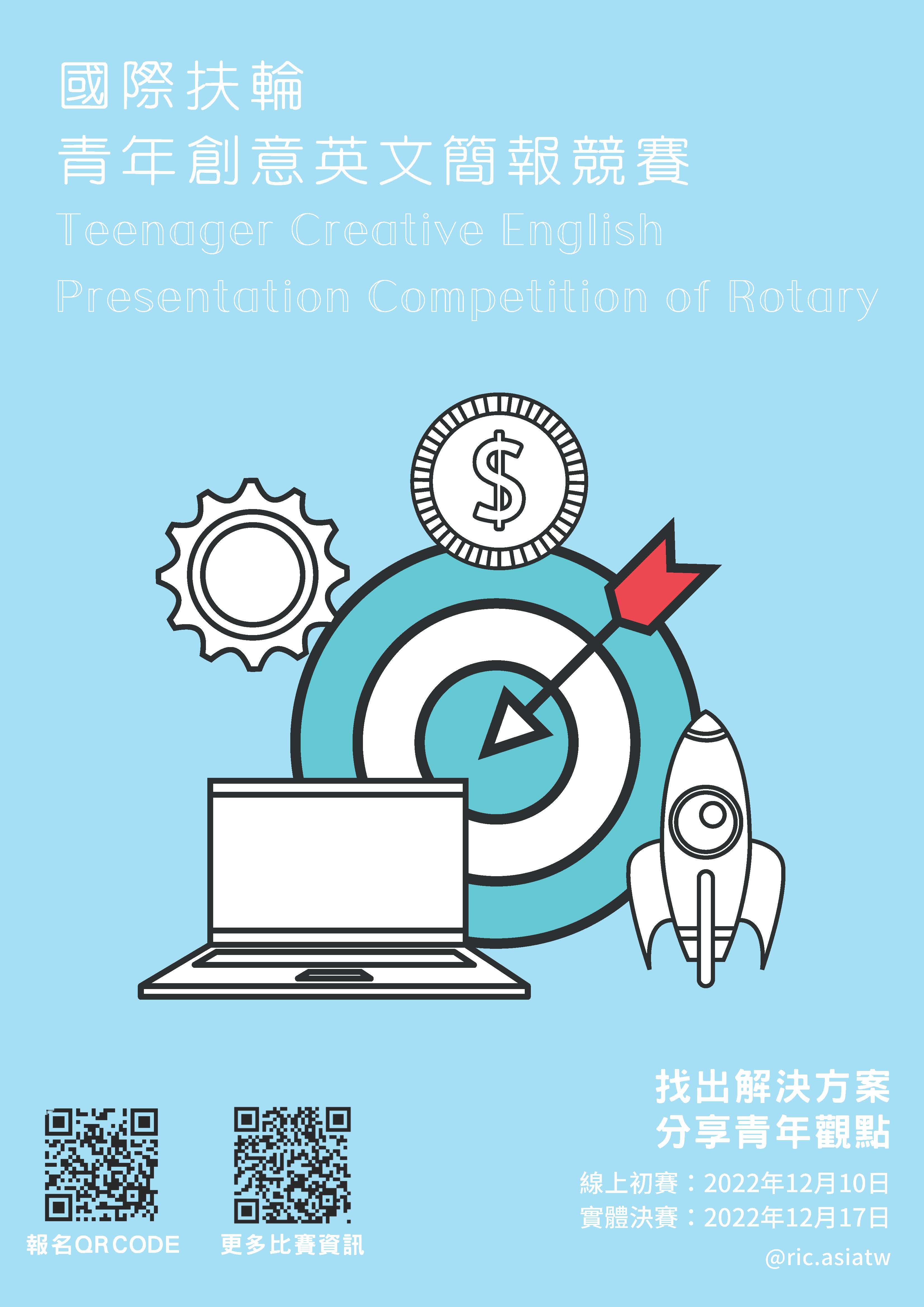 國際扶輪青年創意英文簡報比賽,很遺憾在2021-2022年度因為Covid-19的關係,故停止舉辦。但本活動在2022-2023年度即將回歸,延續2021-2022年度創新的主題加上專業的評審團,請大家再一次地與我們為這個青少年的盛事共襄盛舉。