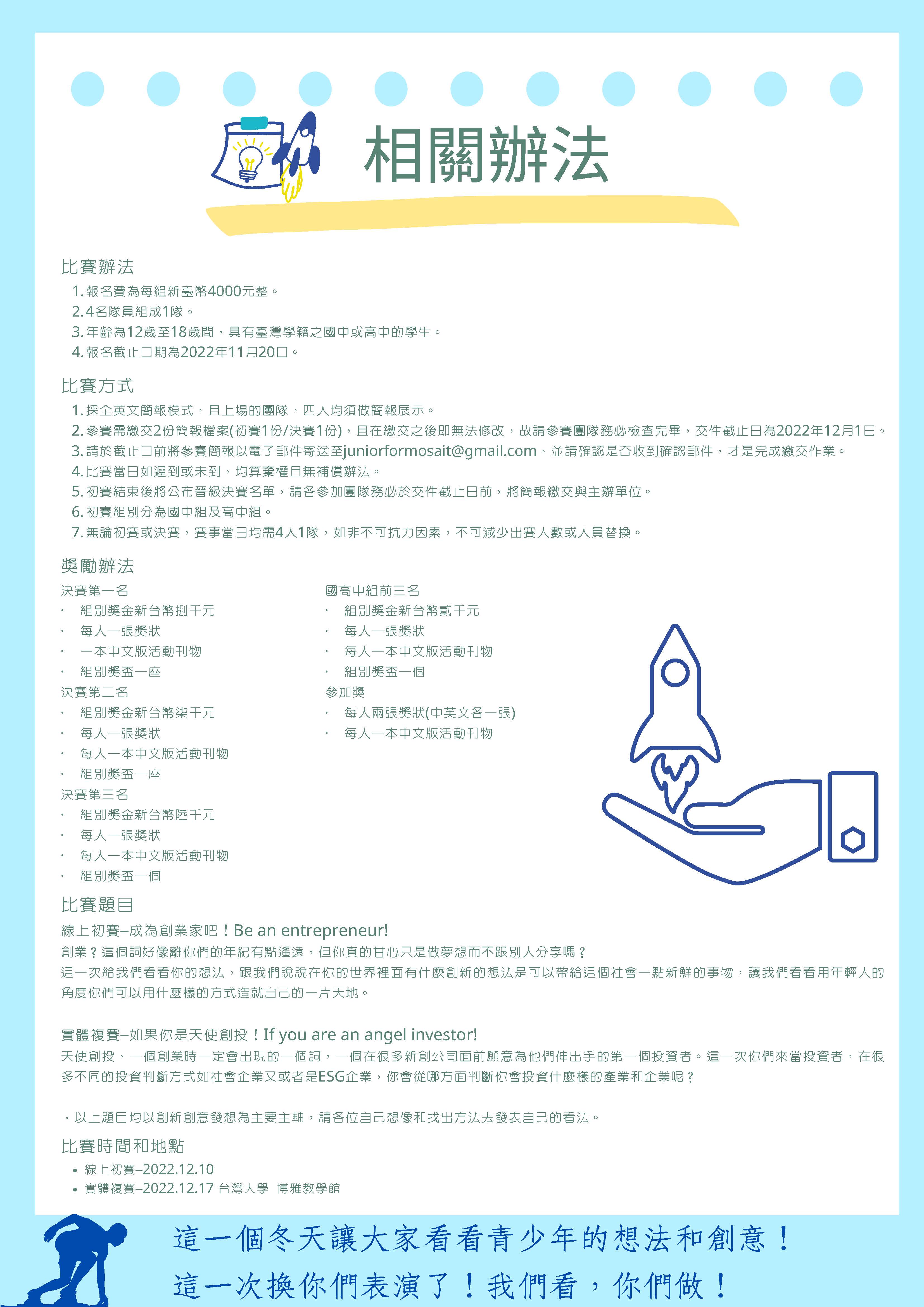 在此我們誠摯邀請國中及高中的青年學子們參與這次的比賽,期許參與這場賽事的青年學子、家長或觀眾,都會因為帶回滿滿的經驗與收穫。