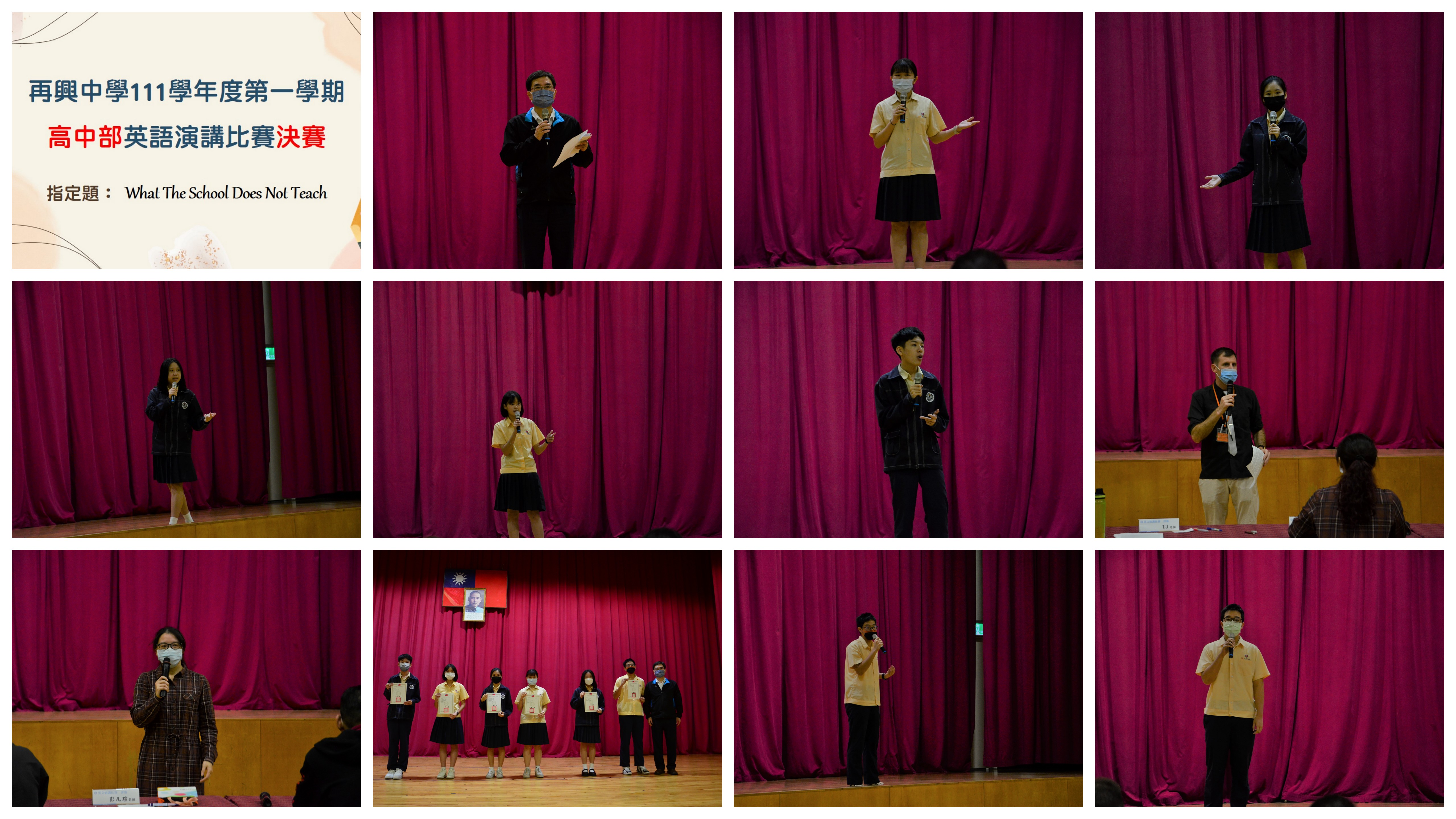 本校111學年度第1學期高中部、九直英語演講比賽決賽由英文科教學研究會主辦、學務處協辦,於111年11月2日高中部週會時間假本校知新樓B3體育館舉行決賽。由預賽績優學生參加,滿分共200分,預賽、決賽滿分各為100分,預賽成績併入決賽計算;決賽經激烈競爭後,成績名次如下: