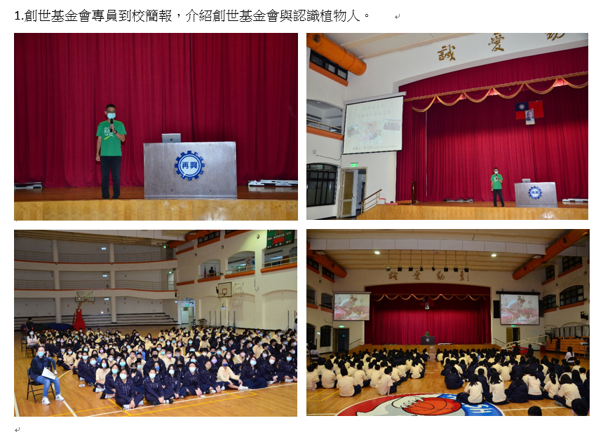 因應12年國教超額比序項目之一的服務學習時數要求,本校學務處為七年級學生規劃創世基金會服務學習活動,今年度為配合新冠肺炎防疫規範,取消前往創世基金會文山分院參訪,特邀李志偉專員到校,透過簡報介紹創世基金會,並以真實案例讓學生們了解植物人的狀態。