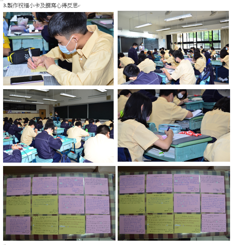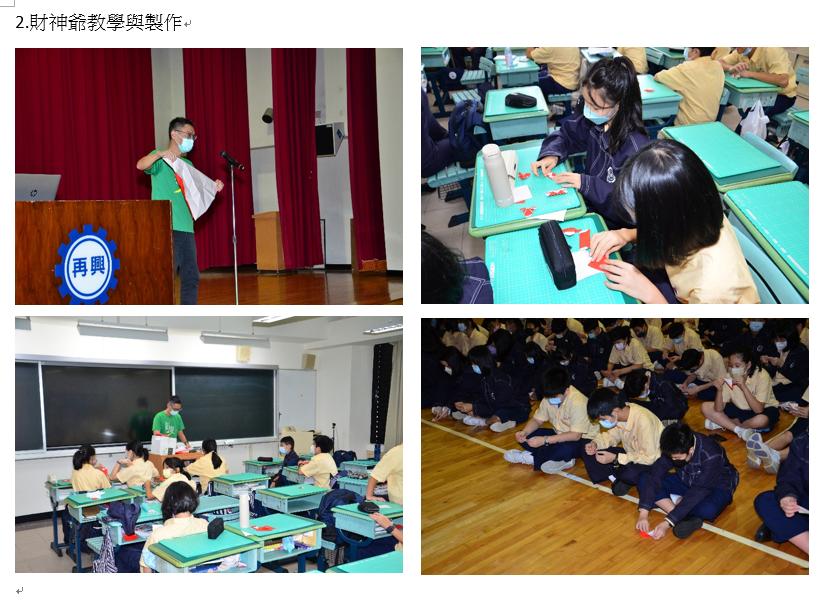 創世基金會提供植物人安養照護,由專業護理人員全天候輪班照顧,包含更換褥墊、沐浴及飲食;其中,每隔2小時為院民翻身一次,進行叩背拍痰,需消耗大量痰袋。經由李專員的教學後,學生們動手為捐款者製作財神爺。最後,孩子們靜下心製作祝福小卡,為創世志工、院民或院民家屬給予支持與鼓勵。