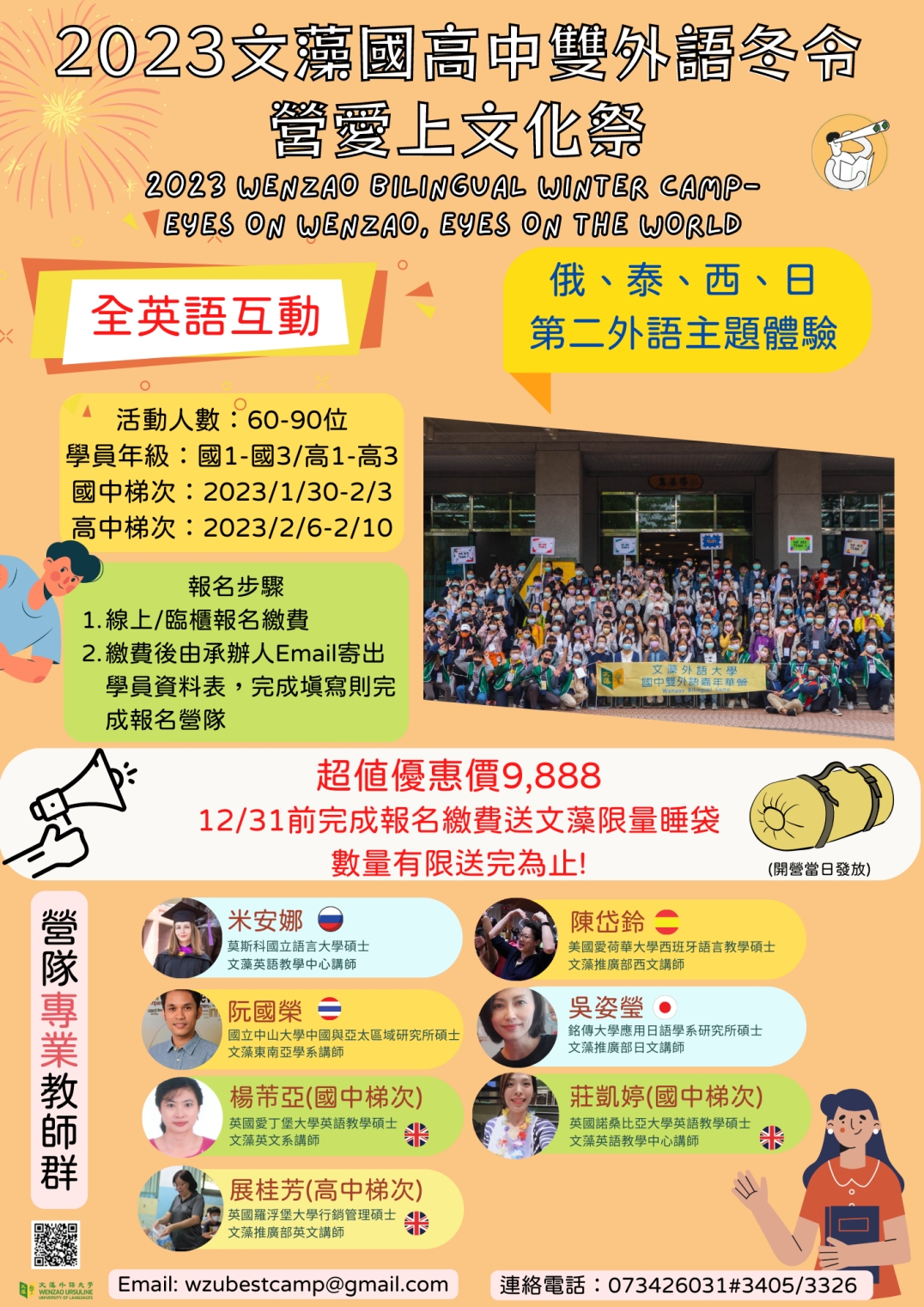 三、活動對象:高中職及專科部一年級至三年級學生(採全英語 教學與活動進行,報名時請檢附111學年度成績單英文70分 以上或全民英檢初級初試通過證明)。