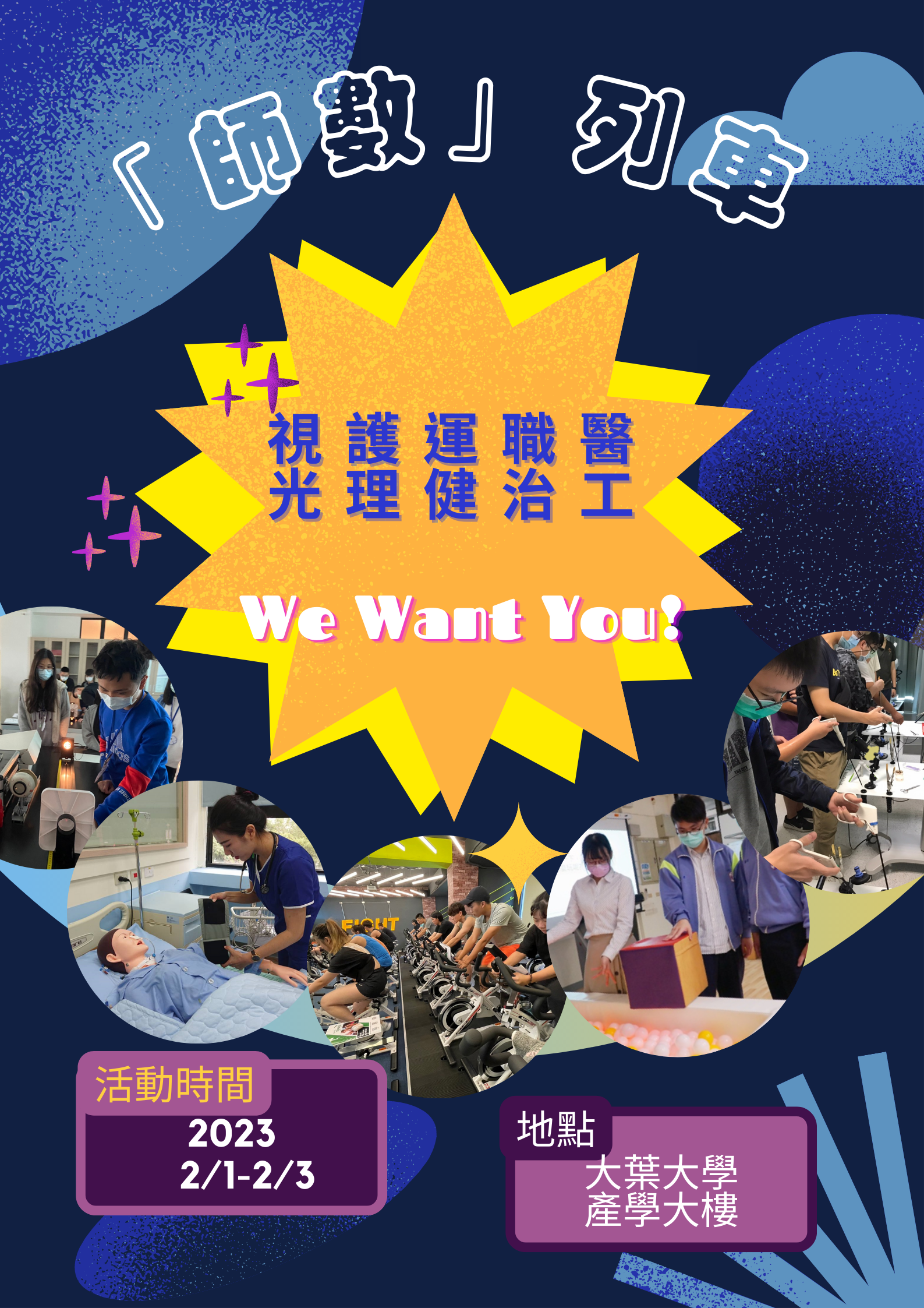 一、主辦單位:大葉大學護理學系系學會、視光學系系學會、 運動健康管理學系系學會、醫學工程學系系學會、職能治 療學系系學會。