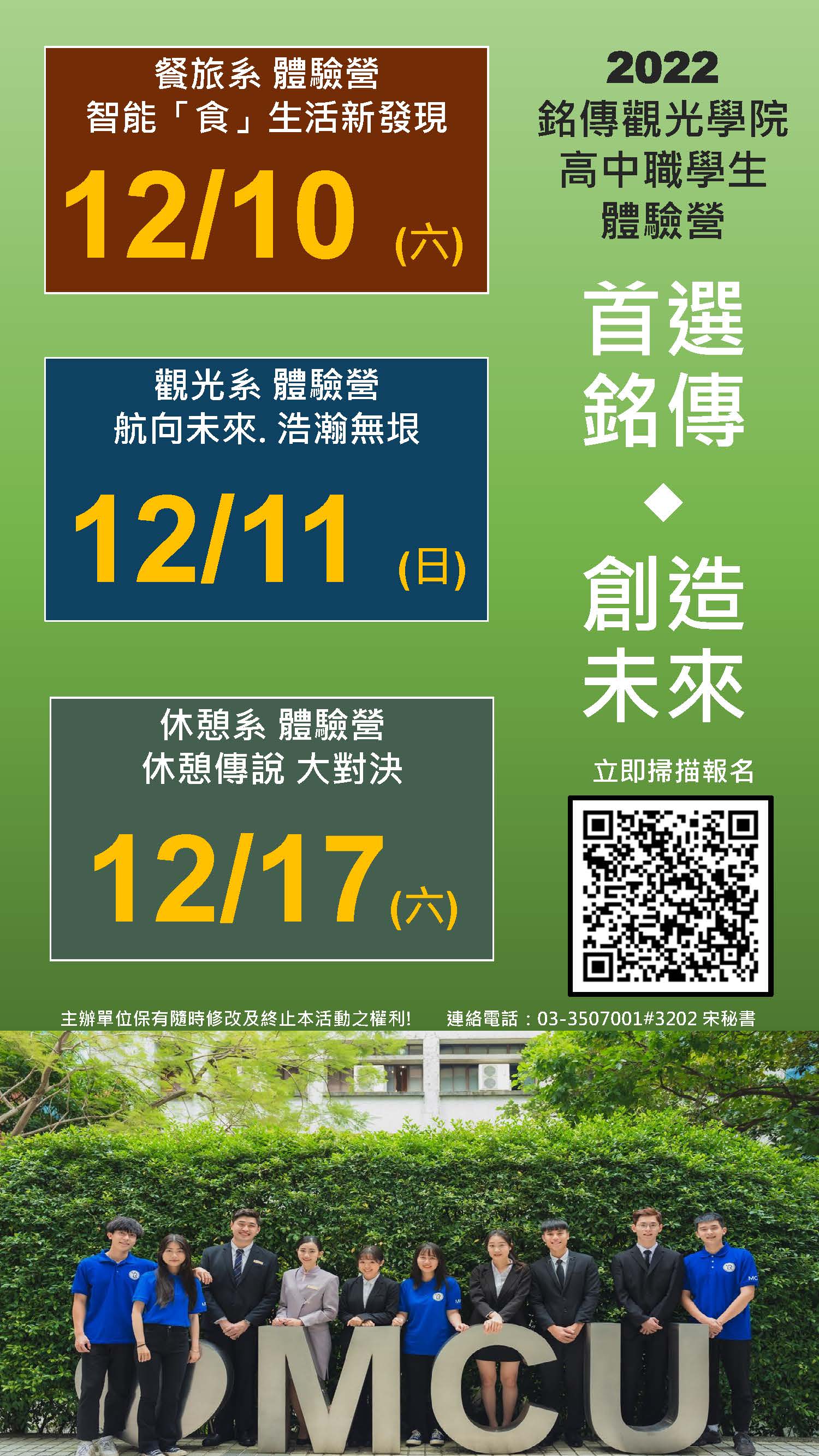 一、為增進高中職學生對本院觀光事業學系、休閒遊憩管理學系與餐旅管理學系之專業課程與特色認識,特舉辦一日體驗營隊。