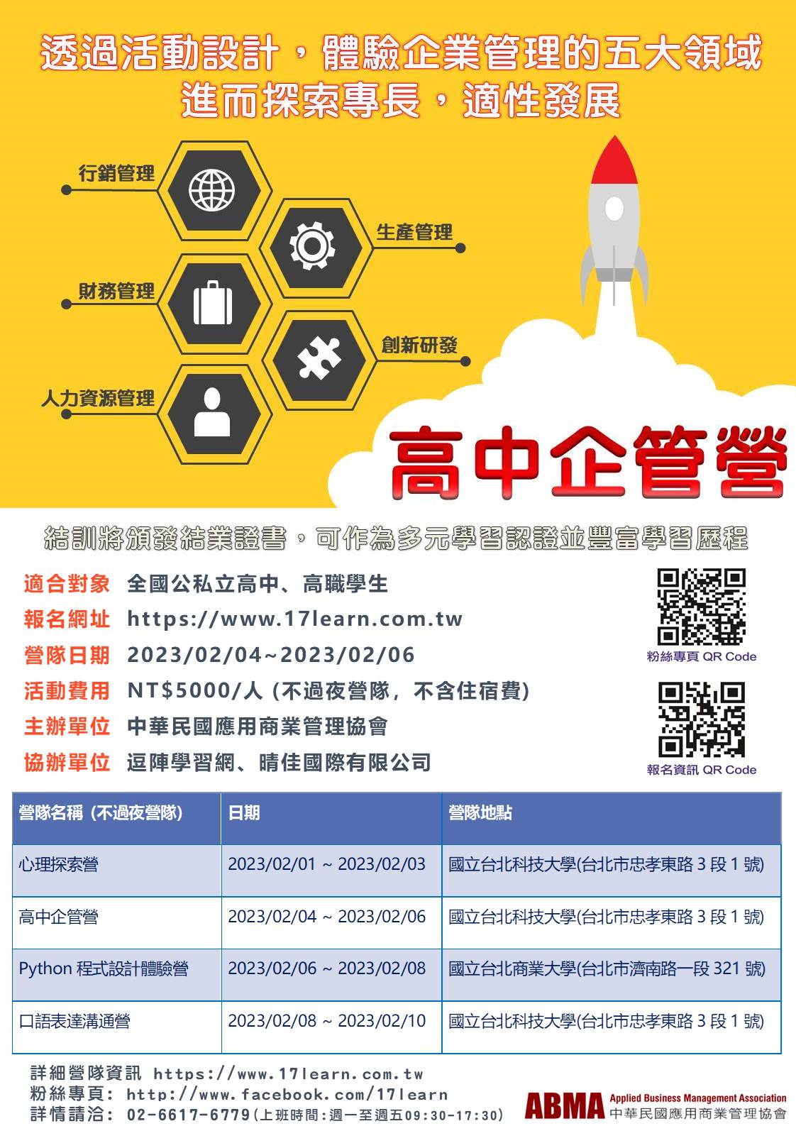 體驗活動、分享回饋、引導討論的模式,使學員體驗企業管理的五大領域,進而探索專長,適性發展營隊。