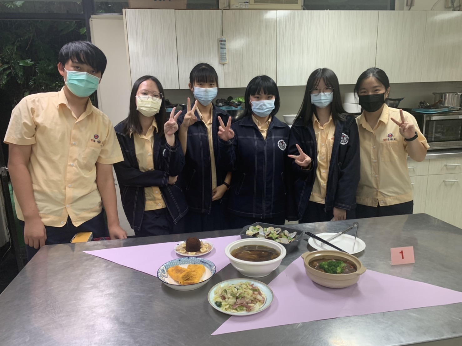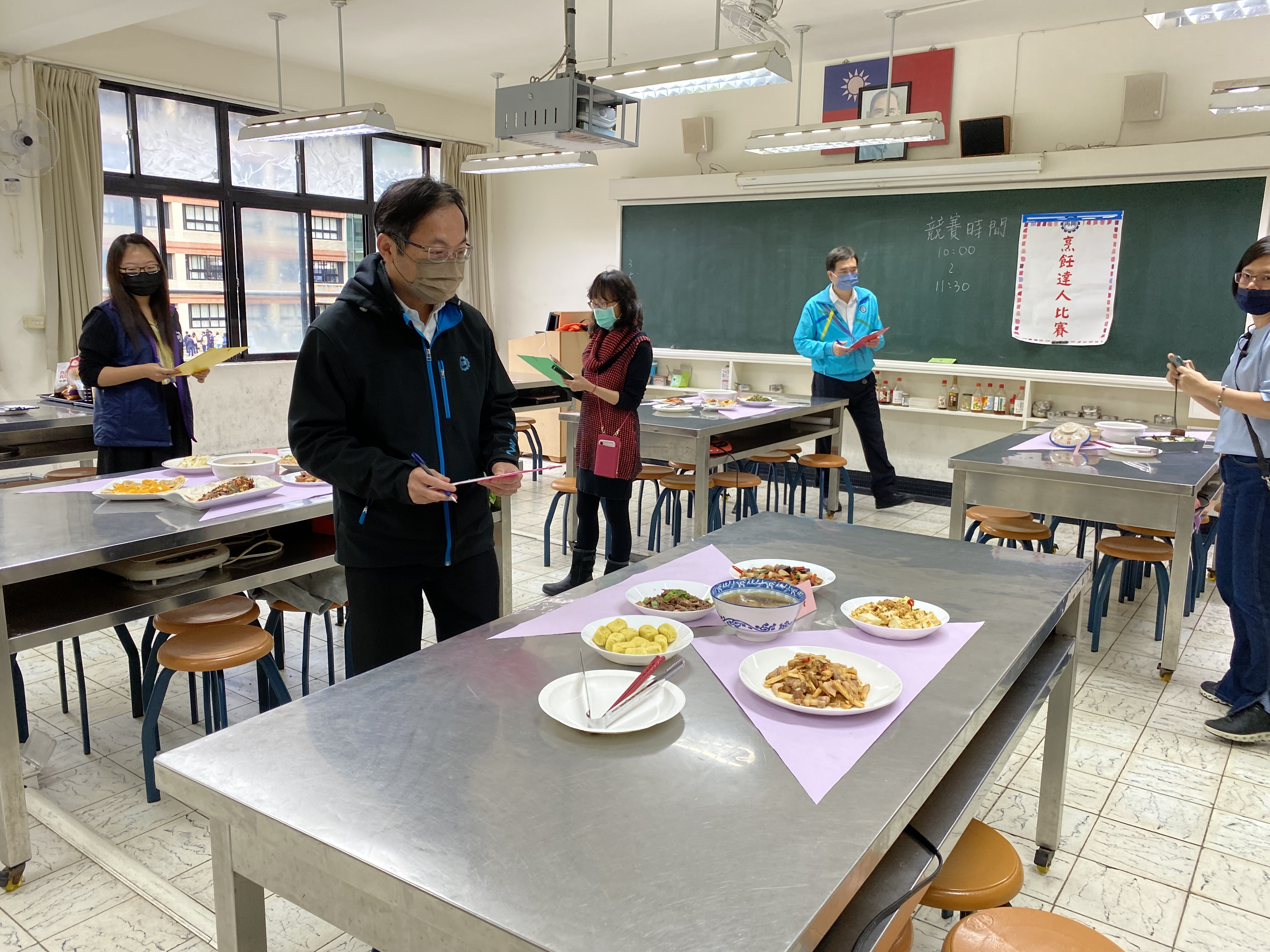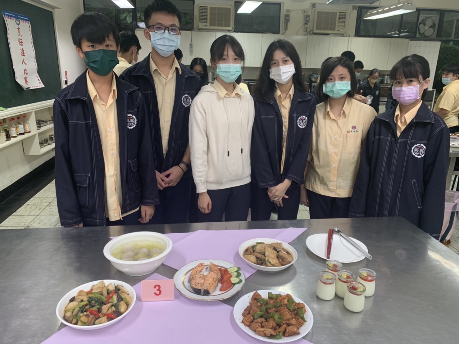 本校111學年度第1學期國中部九年級「廚藝大師」競賽,由教務處主辦,於111年12月8日假本校家政教室舉行。本項活動由韓京倫老師統籌與規劃,主要為增進學生家常料理製作與實務運用之能力,藉由基本烹飪技巧,激發學生團隊討論與合作之潛能,活動主題為「家宴」,四菜一湯一甜點的家常菜料理及飯後甜點,參賽隊伍競爭相當激烈,在擺盤創作及料理美味上都竭盡巧思,創意十足,並邀請校長、教務主任、總務主任、輔導主任、教學組長、劉姵希老師擔任評審,各組成績名次如下:
