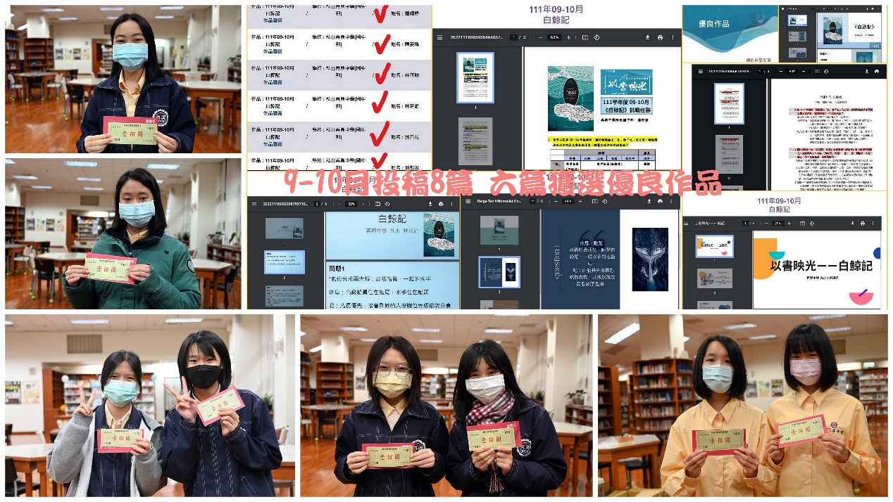 本校國中部同學踴躍投稿參加9-10月份讀本《白鯨記》,校內投稿時逾20人次,經校內評審篩選後推薦8人代表學校參加評比,共有6人獲選為優良作品及2人入選:
