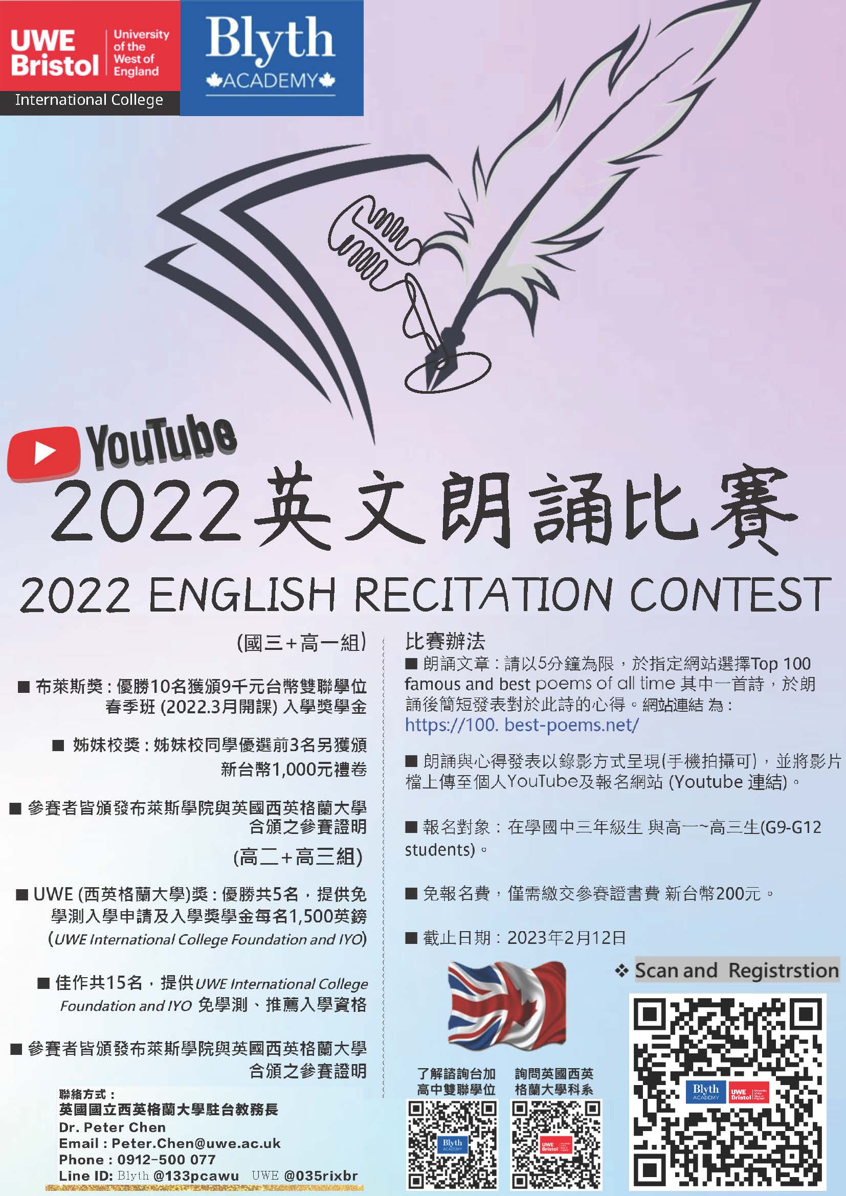 一、 為促進台灣學子英文寫作能力,重視語言基礎。加拿大布萊斯學院 Blyth Academy(加拿大私立中學排名第 1) 與英國國立西英格蘭大學(英國大學排名第 24) 舉辦『2022 聯合英文朗誦比賽』,除提供優勝者高額學費入學獎學金之外,凡參賽者皆提供參加證明以豐富學習歷程與未來申請學校 Portfolio 使用。