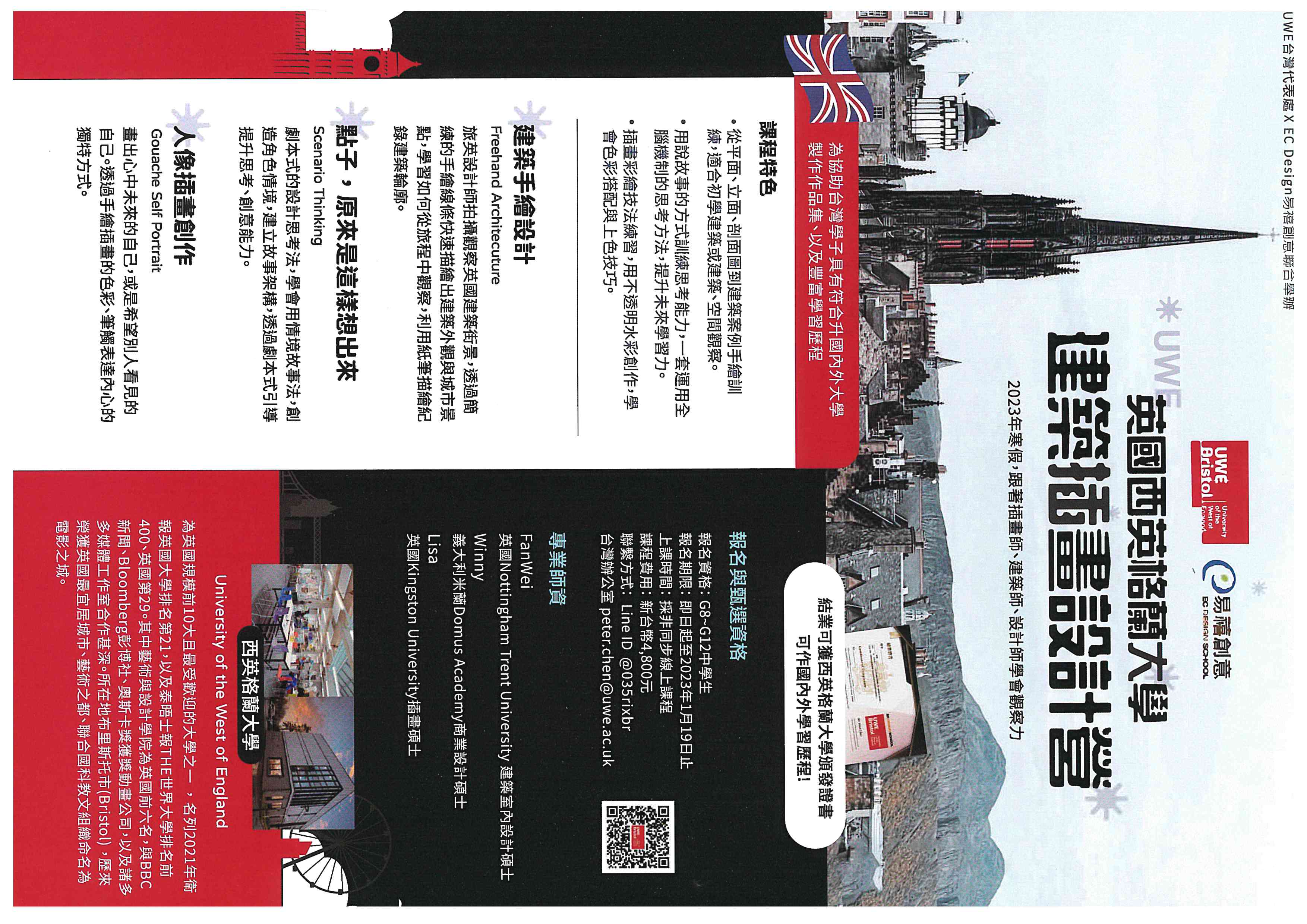 主旨:英國西英格蘭大學 (University of the West of England , UWE)舉辨『2022 英國西英格蘭大學建築插畫設計營』,鼓勵欲培養建築插畫設計基礎的同學報名参加。