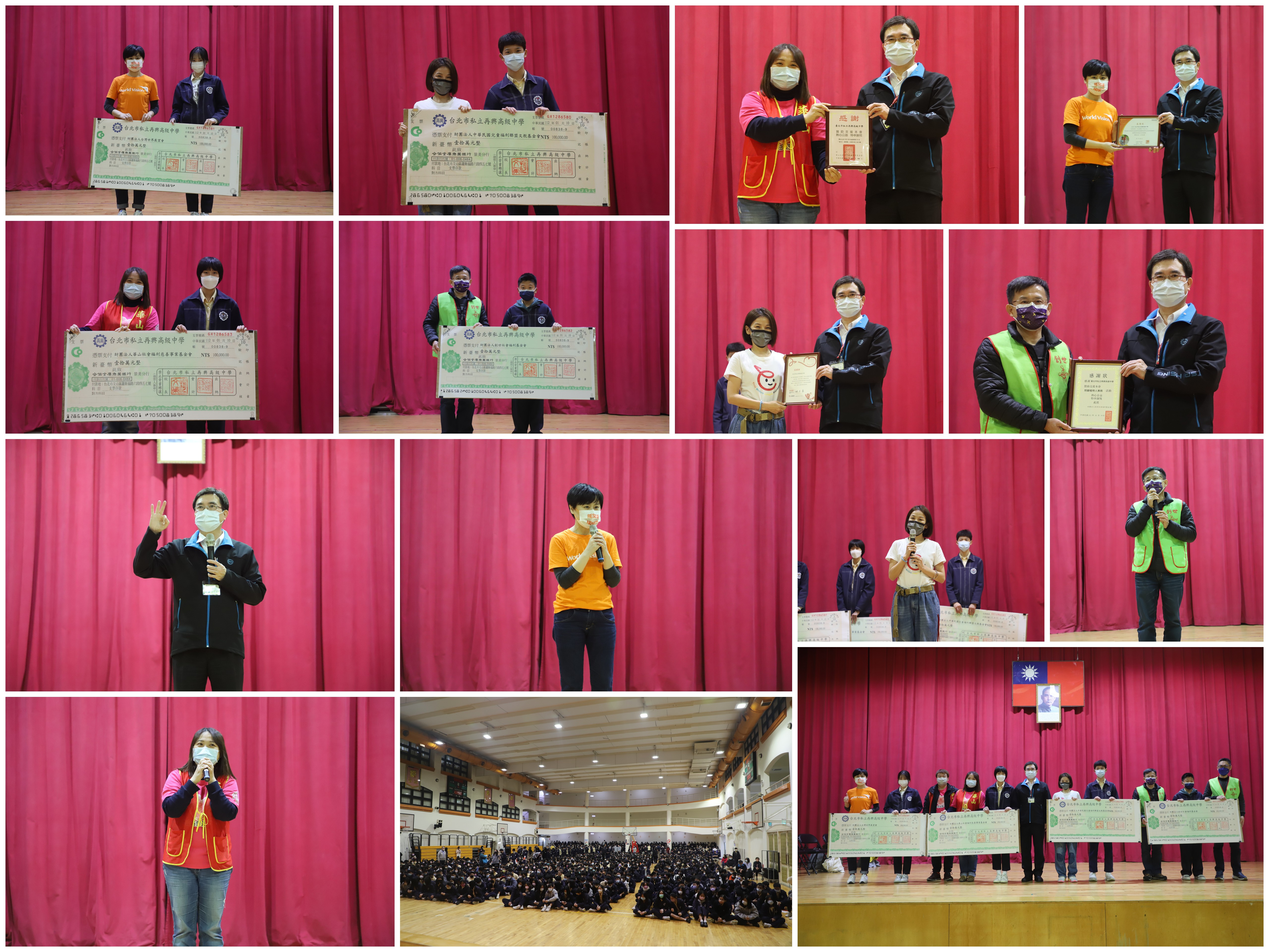 111學年度第一學期「休業式暨74週年校慶愛心園遊會善款捐贈儀式」,於112年1月19日(四)下午2時40分於本校知新樓B3體育館舉行,全校學生參加,授贈單位分別為財團法人台灣世界展望會邱思芸處長、財團法人華山社會福利慈善事業基金會楊雅苓區長、財團法人中華民國兒童福利聯盟文教基金會陳雅惠處長、財團法人創世社會福利基金會陳春智組長,並由捐款績優社團與班級派代表致贈善款,同時由校長接受捐贈單位感謝狀。
