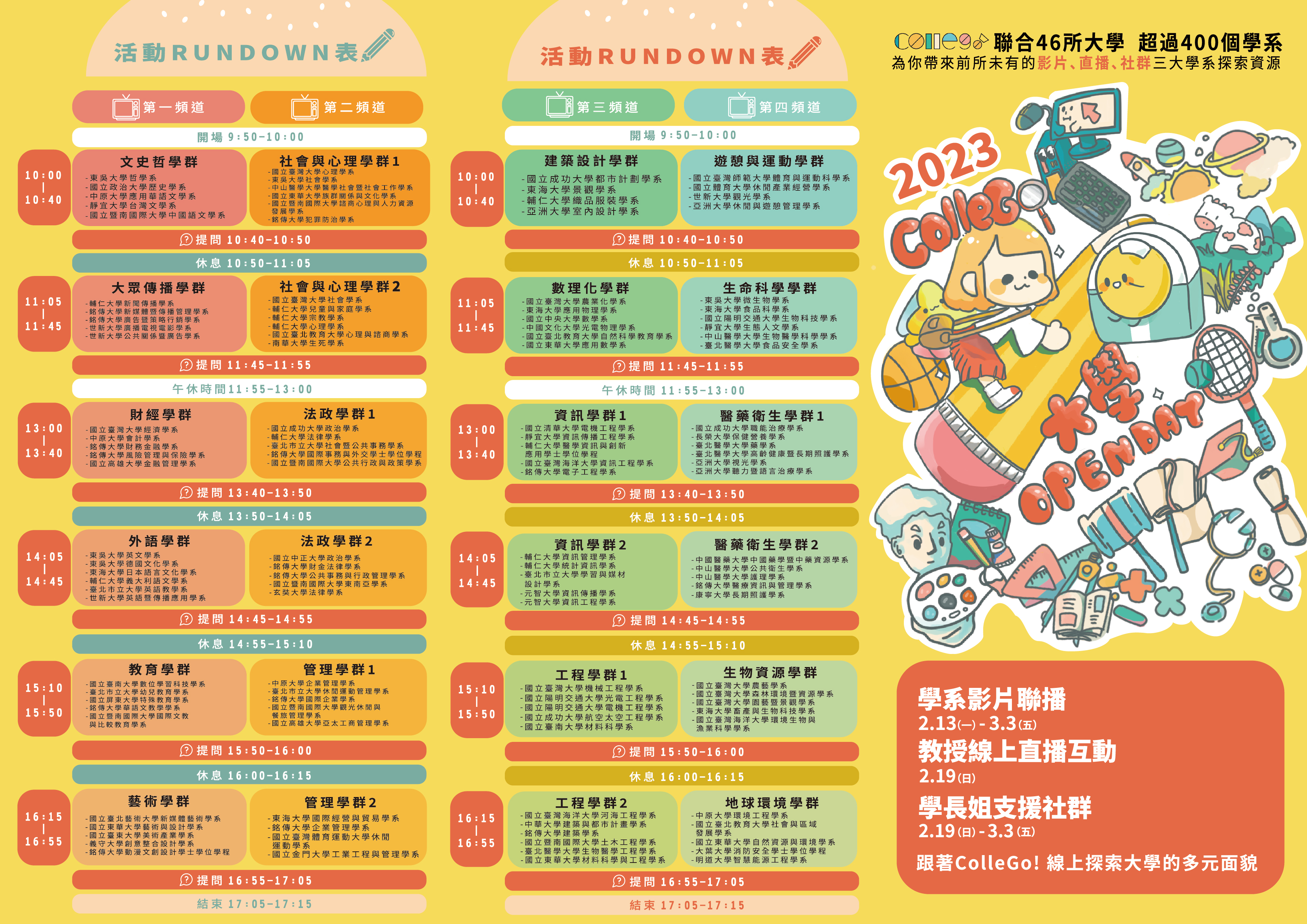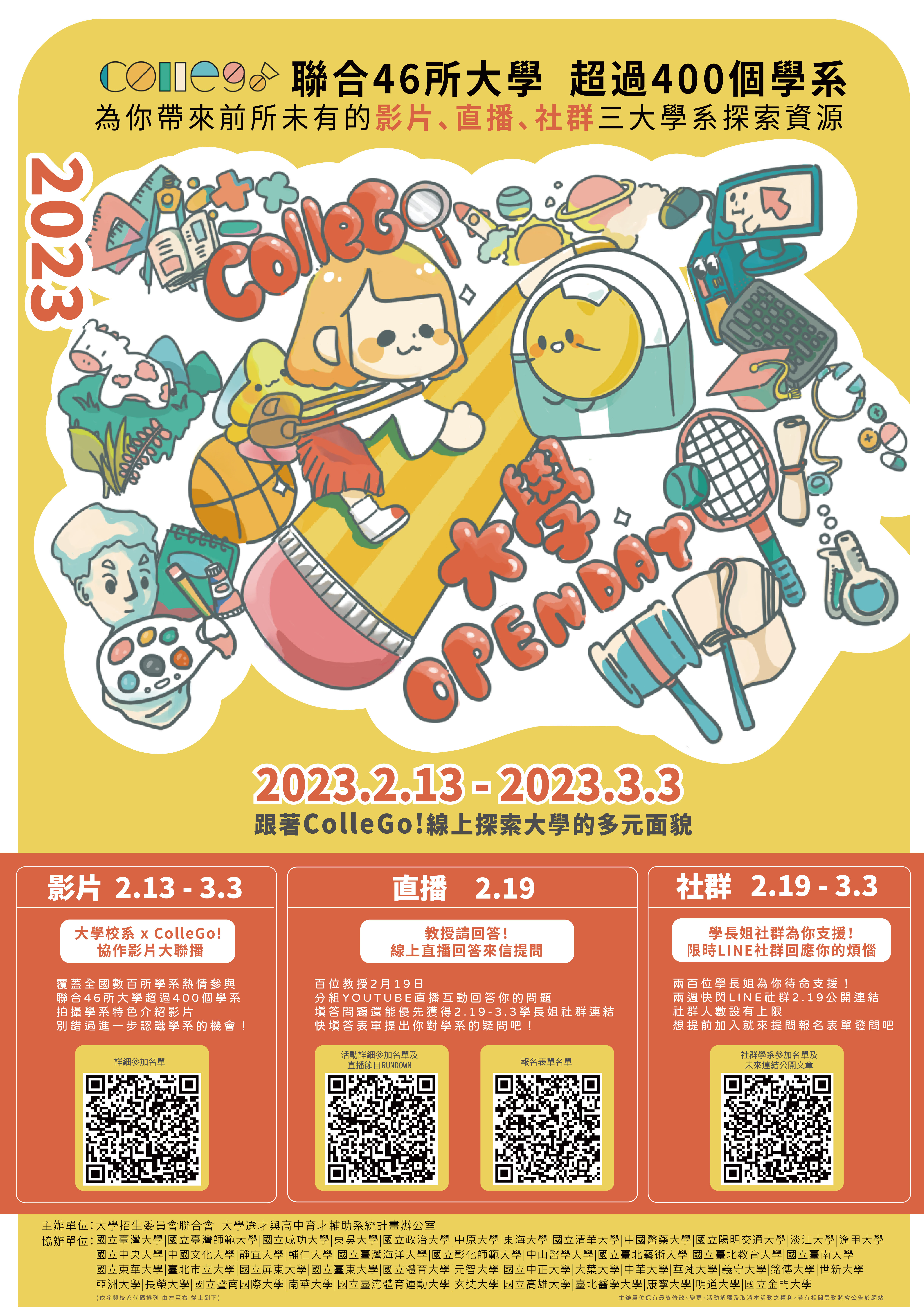 一、大學招聯會「大學選才與高中育才輔助系統計畫」訂於112年2月13日至3月3日舉辦ColleGo!大學OPEN DAY系列活動。