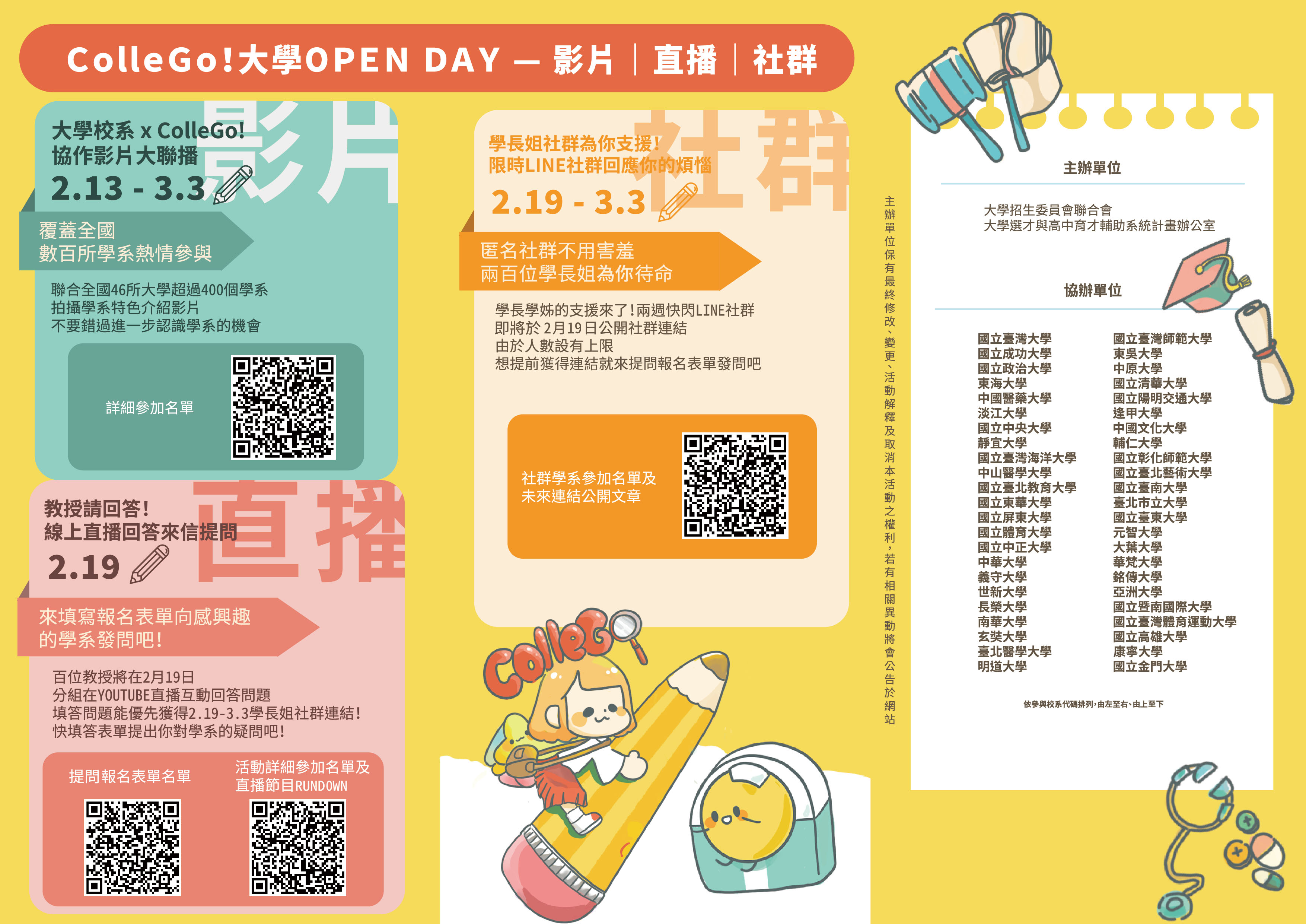 二、旨揭活動由大學招聯會大學選才與高中育才輔助計畫辦公室主辦,並由全國40餘間大學聯合協辦。