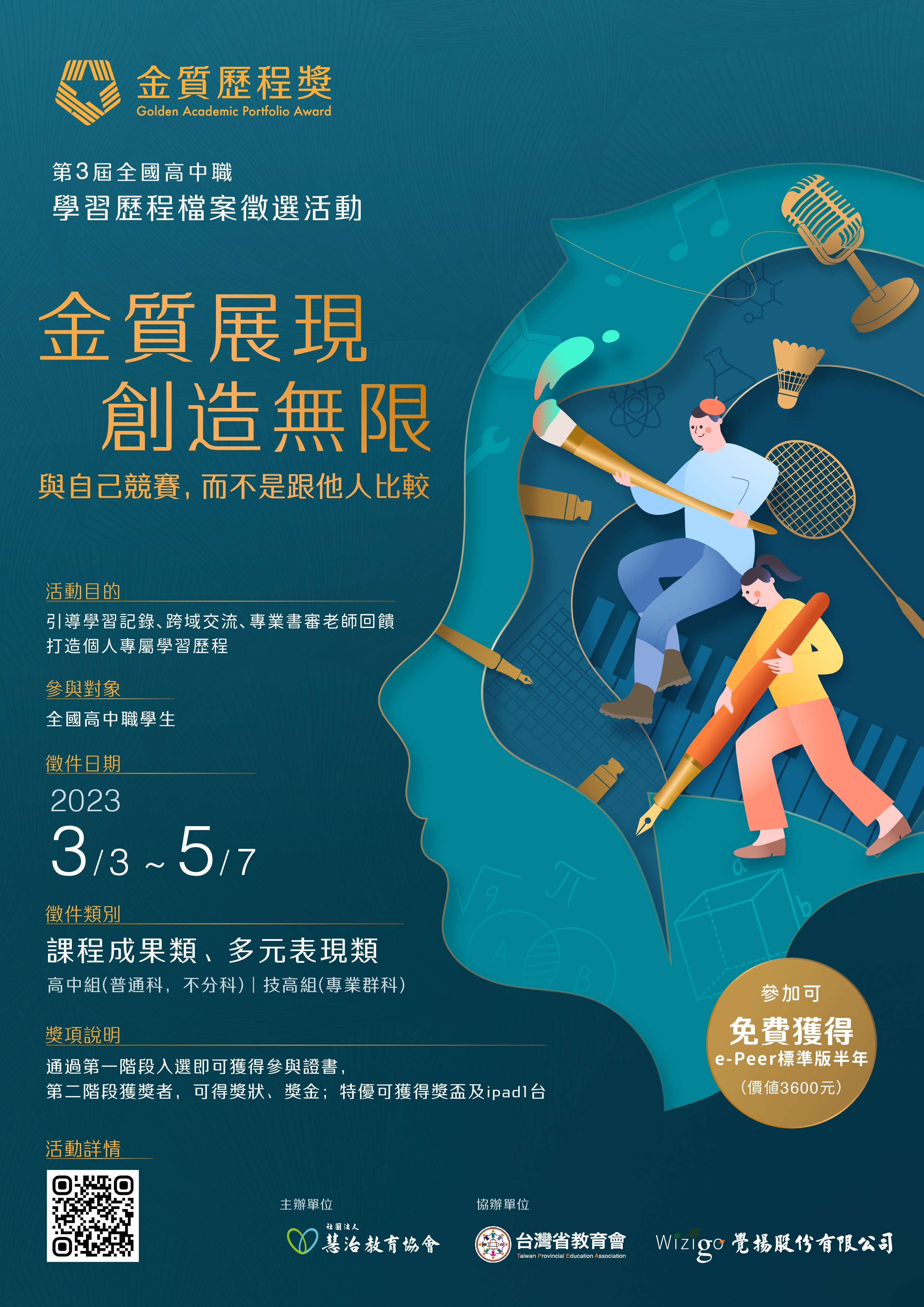 學習歷程檔案徵選活動【金質歷程獎】,鼓勵學生報名活動並上傳學習歷程檔案,除了可獲得書審老師給予的實質回饋,