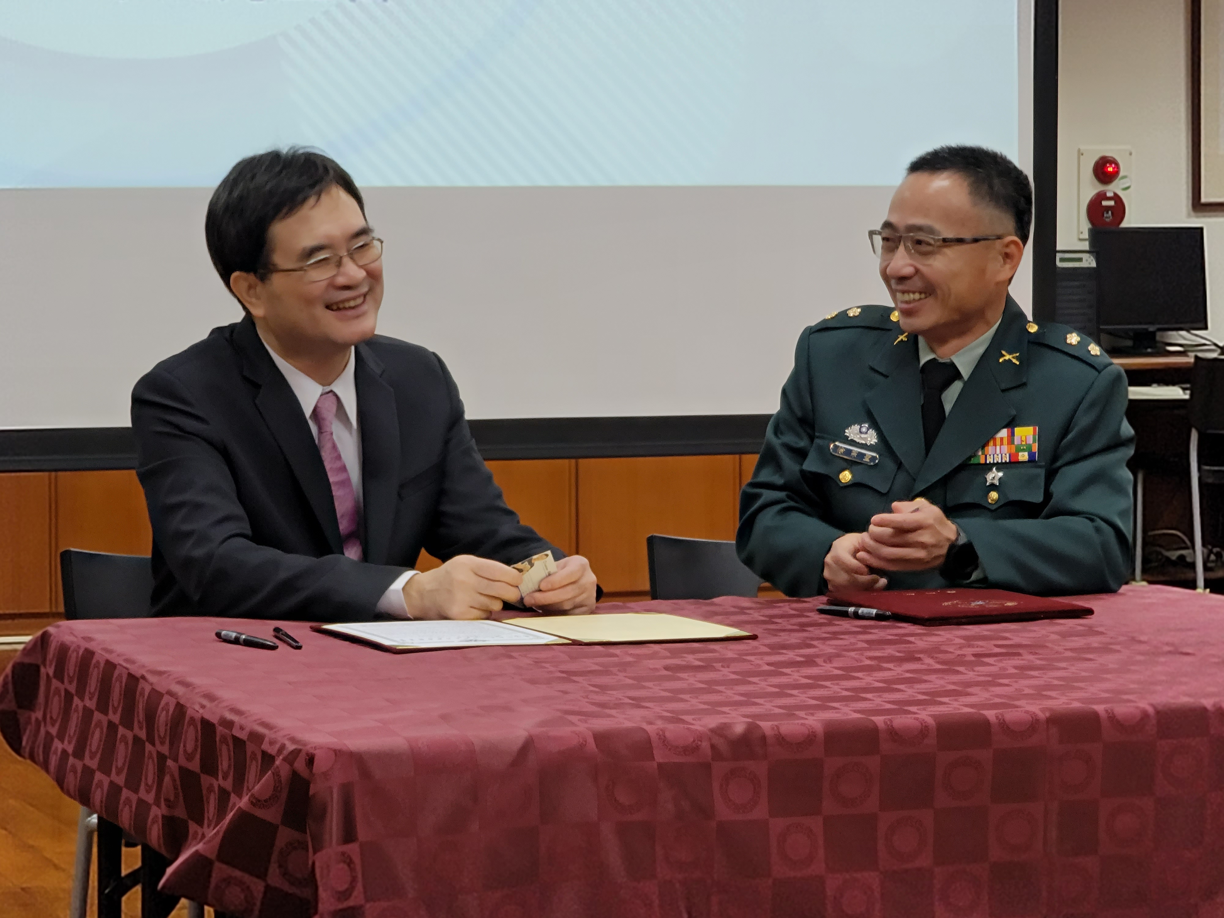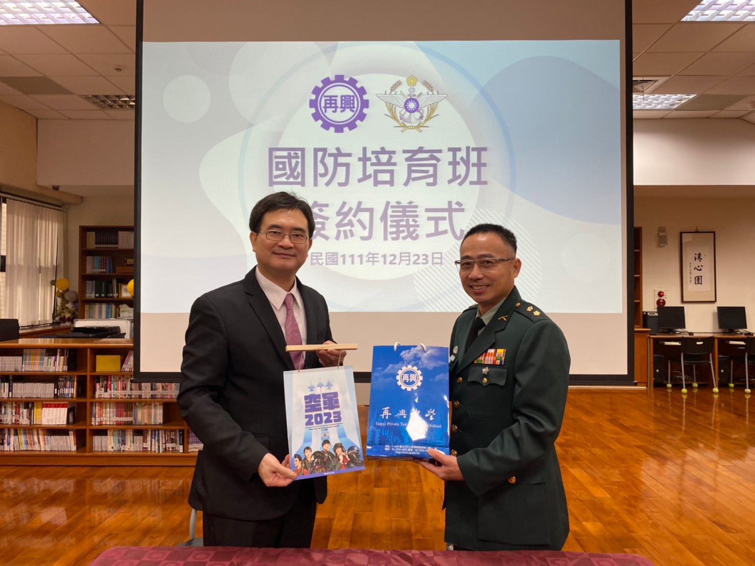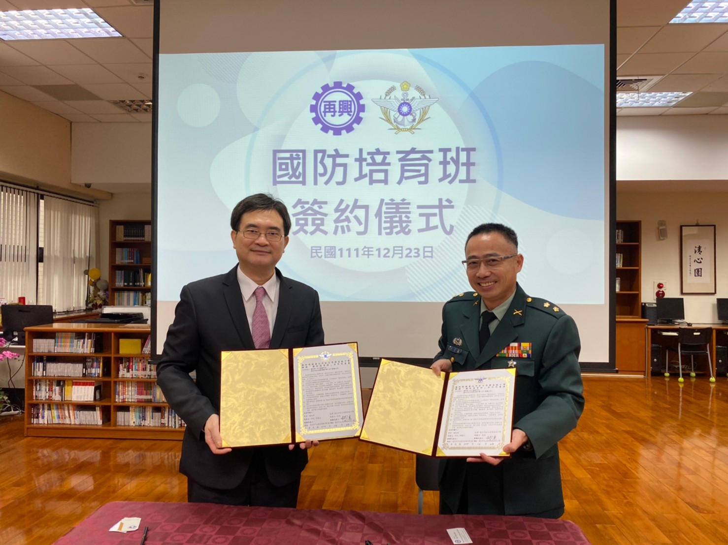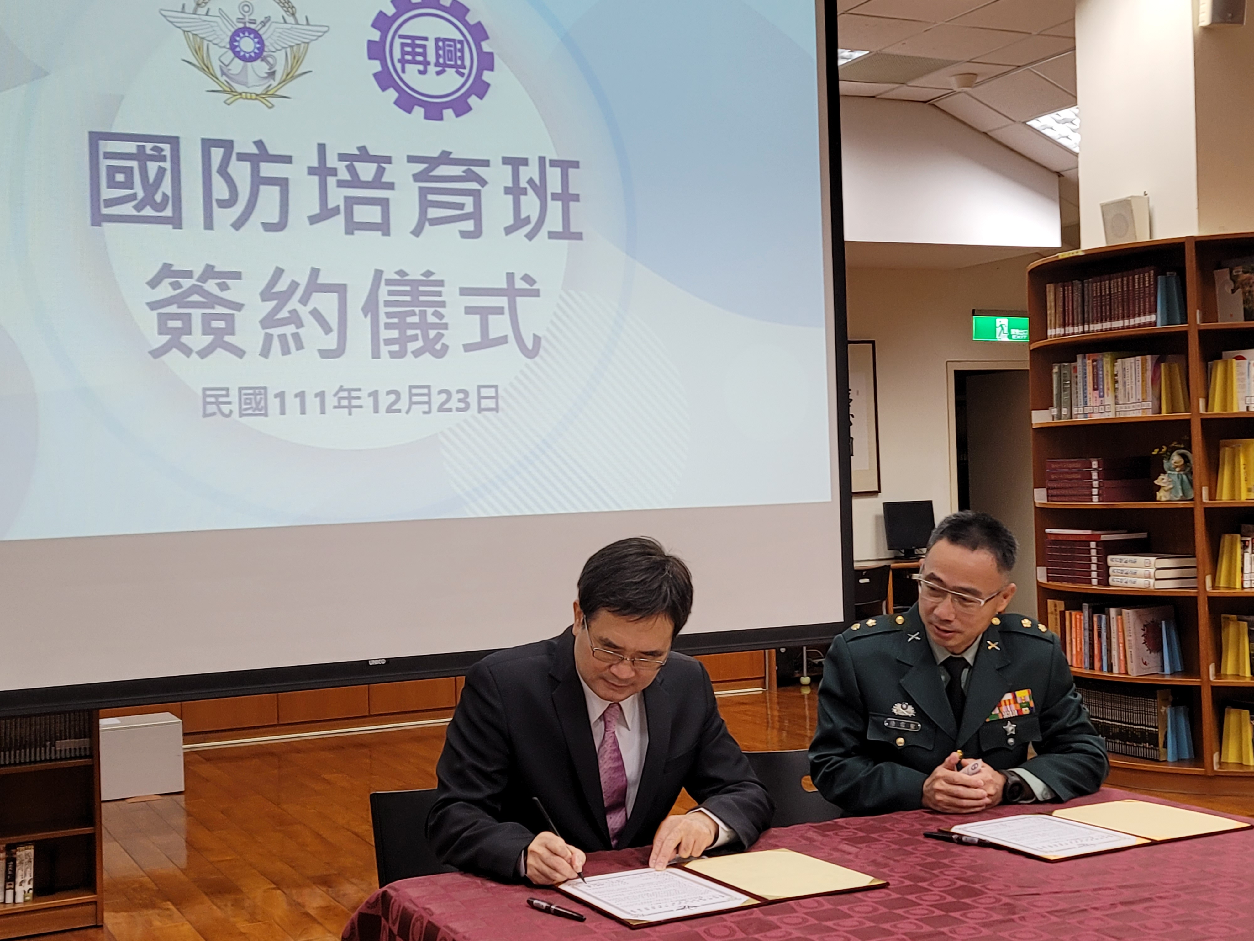 副主任徐宗聖中校代表國防部與本校柯文柔校長於111年12月23日(五)上午假本校圖書館簽訂「國防培育班」