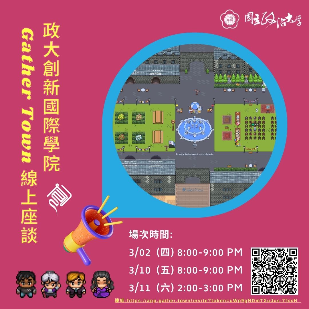了解本學院,茲舉辦「2023 年Gather Town 與高中生線上座談」活動,提供創新國際學院特色介紹及解說,並可線上直接與