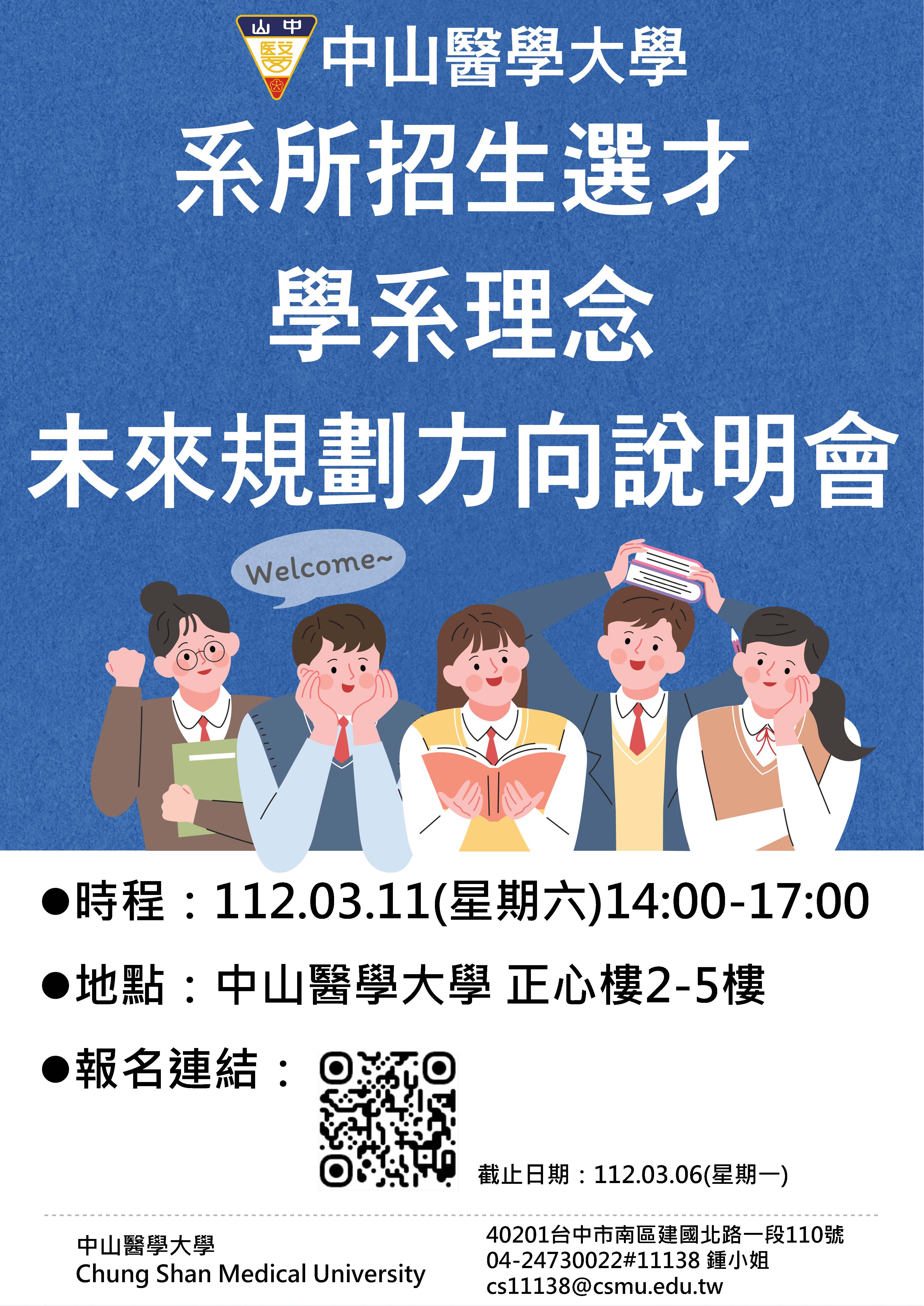 一、活動目的:為使家長和學生深入瞭解中山醫學大學各學系的教學理念和未來規劃方向,特辦理說明會以增進家長對