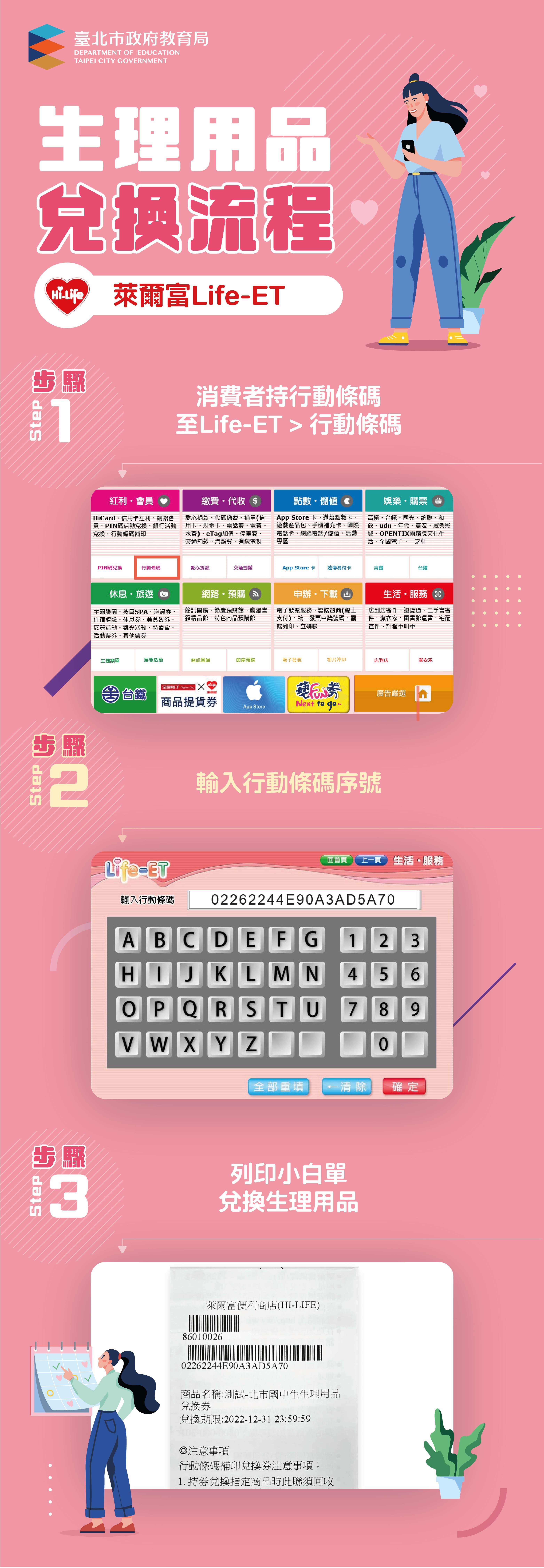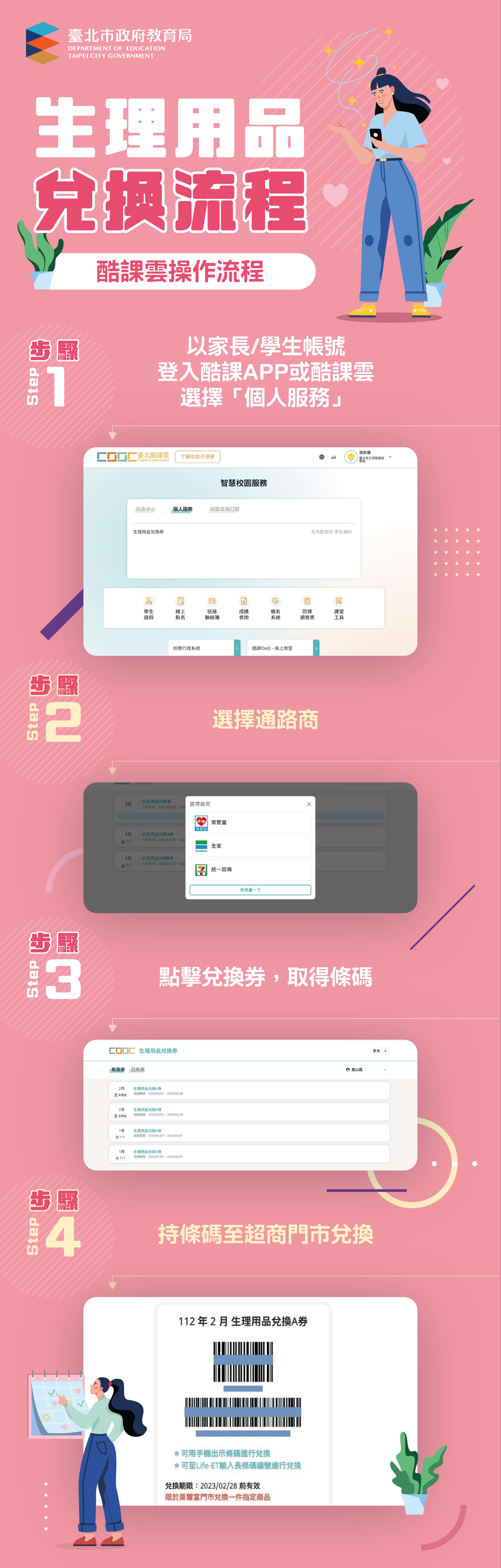「112年國中小女性生理用品補助計畫」第1期兌換券2張,將於3月1日發放,兌換效期至112年4月30日止。兌換方式與流程,重點摘述如下: