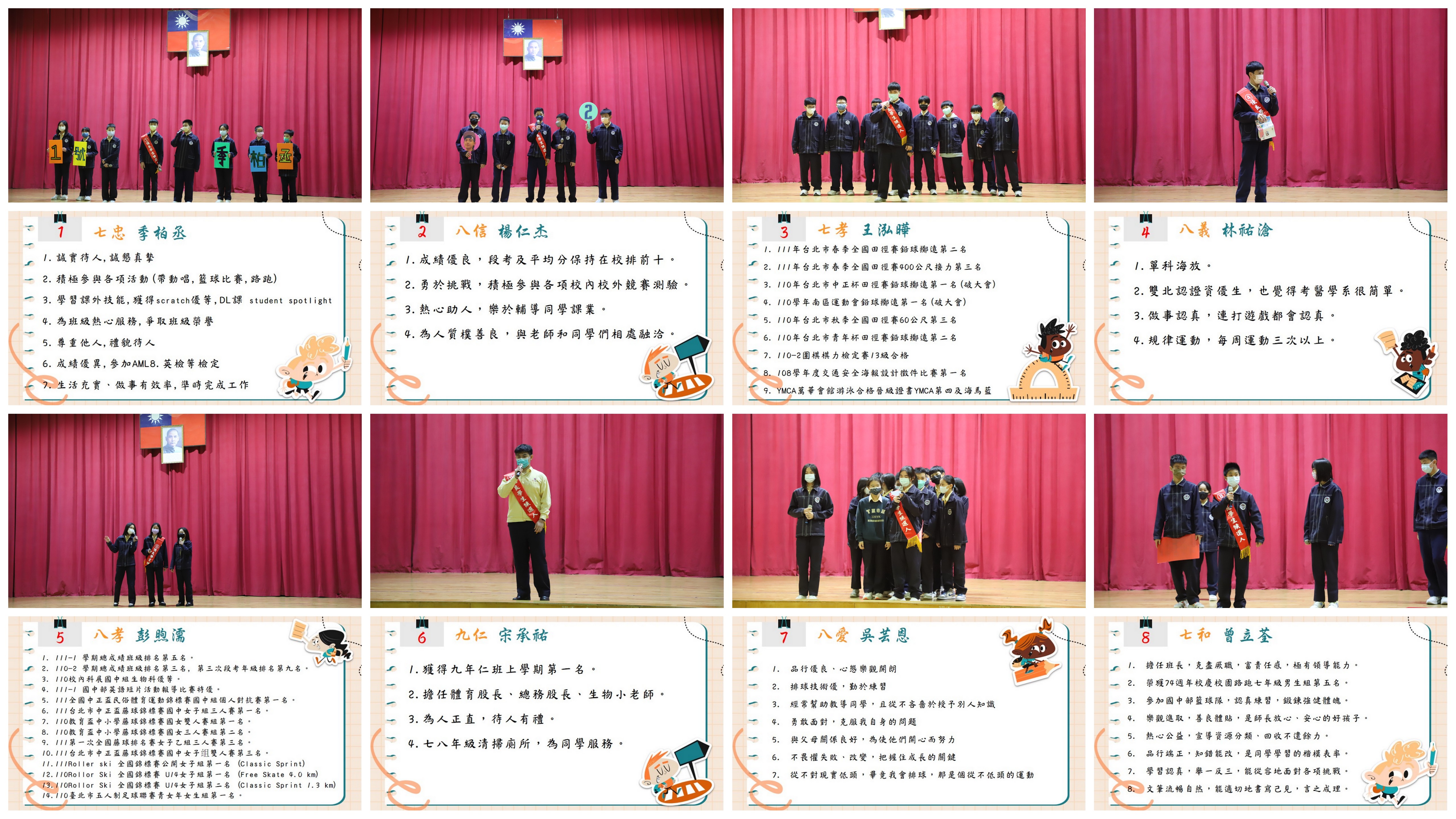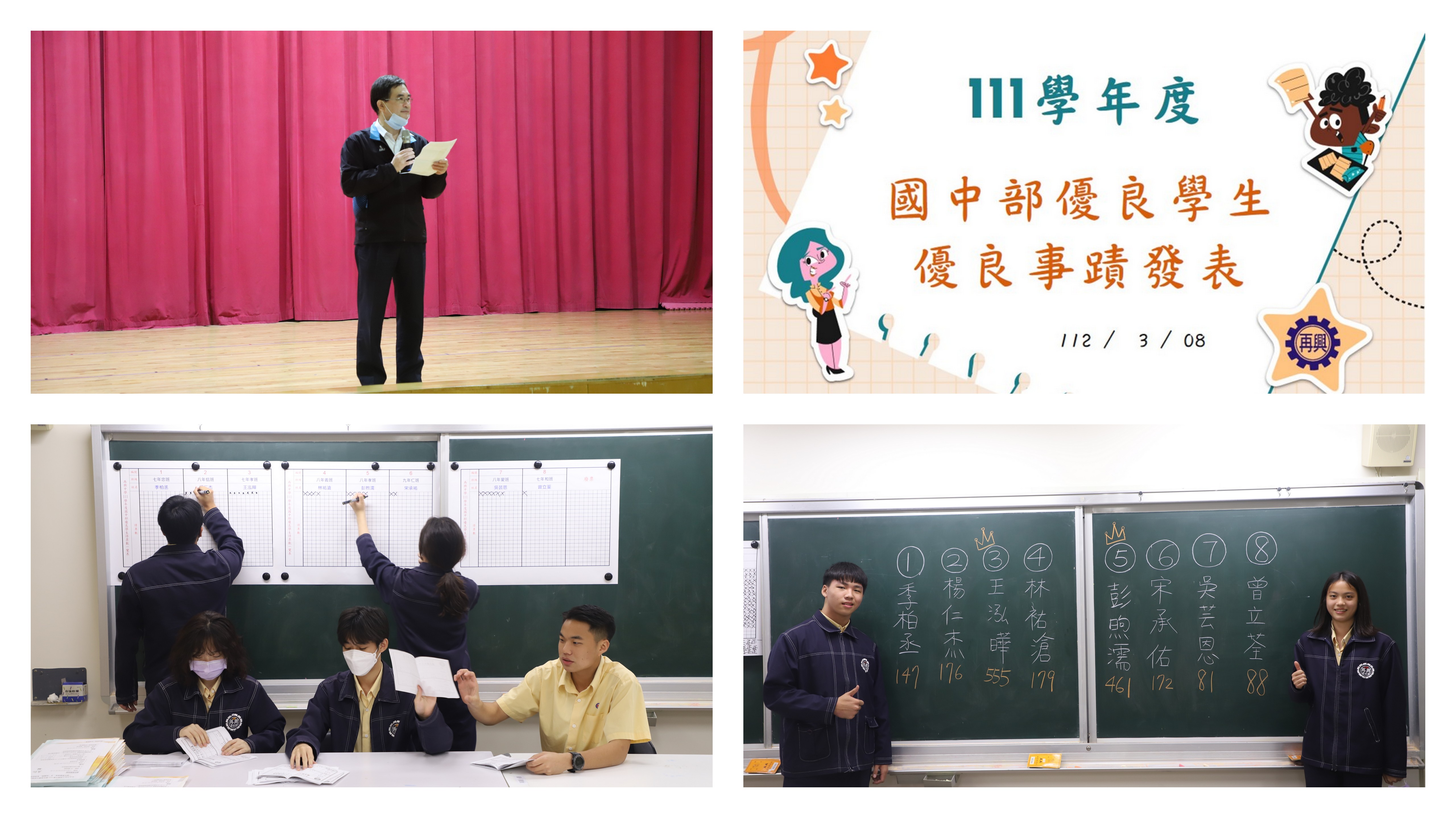 為配合臺北市教育局辦理臺北市111學年度全市優良學生選拔活動,本校國中部先於2月24日產生班級優良學生,各班級優良學生再依個人意願報名參加全校優良學生競選。學務處於3月8日(星期三)週會時間辦理國中部候選人優良事蹟發表會,每位候選人發揮行銷自我的創意,展現個人特質。本學年共有8名同學參加競選,名單如下: