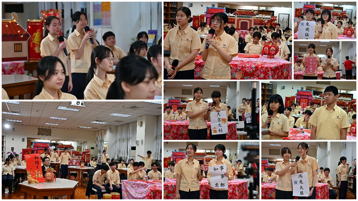 活動分成三部分進行,在兩位主持人開場後,第一部分為介紹2023臺灣燈會,由二誠王婕恩、二勤簡琳軒及二勇簡慈伶3位同學以影片及投影片方式一一介紹;第二部分介紹中國人春節習俗文化,由一誠王芃云、鄧博元及一勇侯豫安負責介紹;第三部分為吉祥話祝福,由高一各班兩位同學分別解說一句祝福語……而在每一段同學介紹後,同時點名與該名同學Line筆友的城南外高同學出列,此時線上傳來許多驚呼聲,大家拿下口罩彼此互相打招呼……活動在彼此線上相認的歡樂聲中畫下完美句點,最後以線上線下的大合照為本次活動留下美麗倩影!