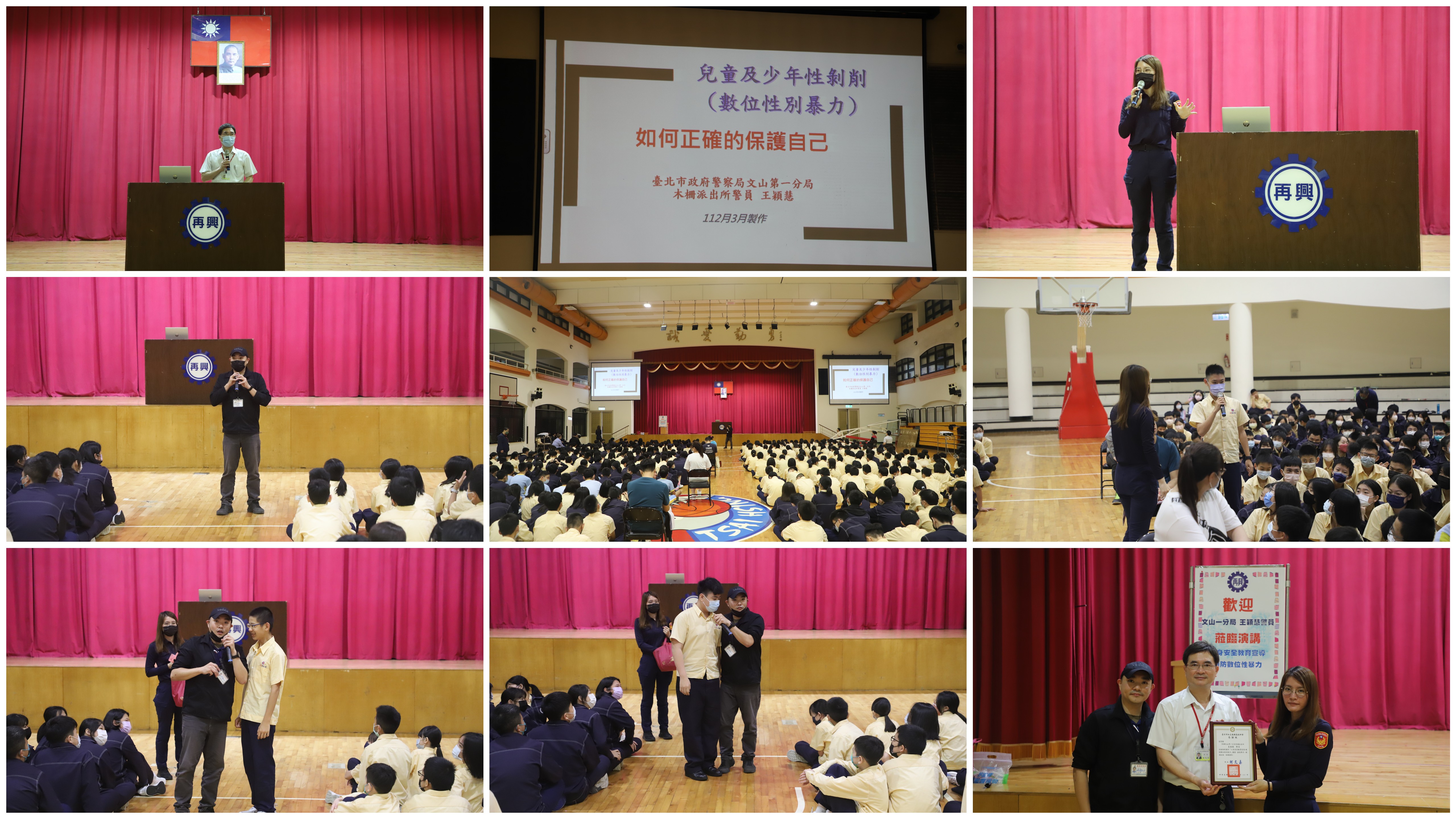 今天特別邀請臺北市政府警察局文山第一分局木柵派出所王穎慧警員與李碩華警官蒞臨本校進行【兒童及少年性剝削(數位性別暴力)】講座。首先講師從網路交友議題讓同學了解網路內隱藏的危險,並舉例說明。但網路交友因其便利、隨機與不透明性,也給予有心人士犯罪可能機會,衍生對人身安全危害,常有色情、騙財、騙色的事情發生,隱藏著深不可測的危機,針對數位性別暴力議題,在如何能正確的保護自己,並做到:自我保護機制建立不拍攝、不留存、不傳佈與要截圖保存等要點,希望同學能把常犯的錯誤觀念改掉以及危害時,應勇於求助於他人(父母或警察等)與撥打專線電話;另外講師在演說過程中加入有獎徵答方式與學生熱絡互動,期望本次校園兒童及少年性剝削(數位性別暴力)講座能達之成效。