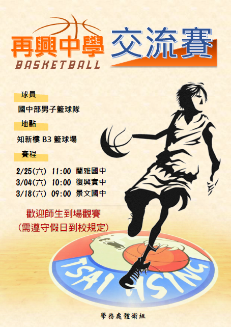 為提升本校國男籃球員戰力並累積賽事經驗,體衛組特於期初安排校際交流賽,分別於2月25日、3月4日、3月18日邀請蘭雅國中、復興實中、及景文國中蒞校切磋,同時也邀請師生及球員家長到場觀賽。