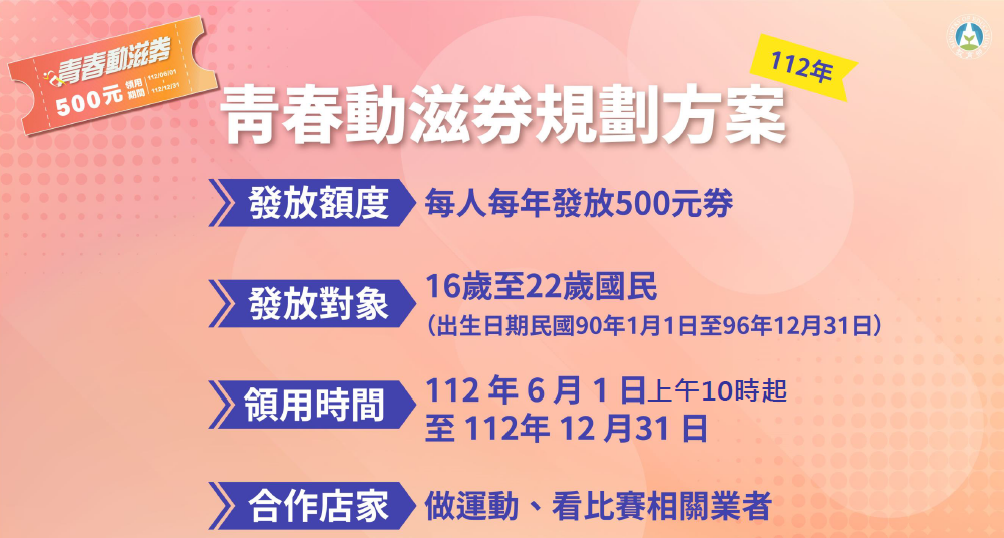 一、教育部體育署為延續動滋券成效,及鼓勵青年族群積極參與體育活動或觀賞賽事,讓運動成為伴隨青春歲月的美好回憶,規劃每年常態性發放16至22歲國民每人500元青春動滋券。