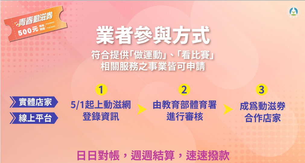 (四)適用範圍:提供做運動、看比賽相關服務,且經本署審核通過之青春動滋券合作店家。合作店家資訊可於動滋網查詢。