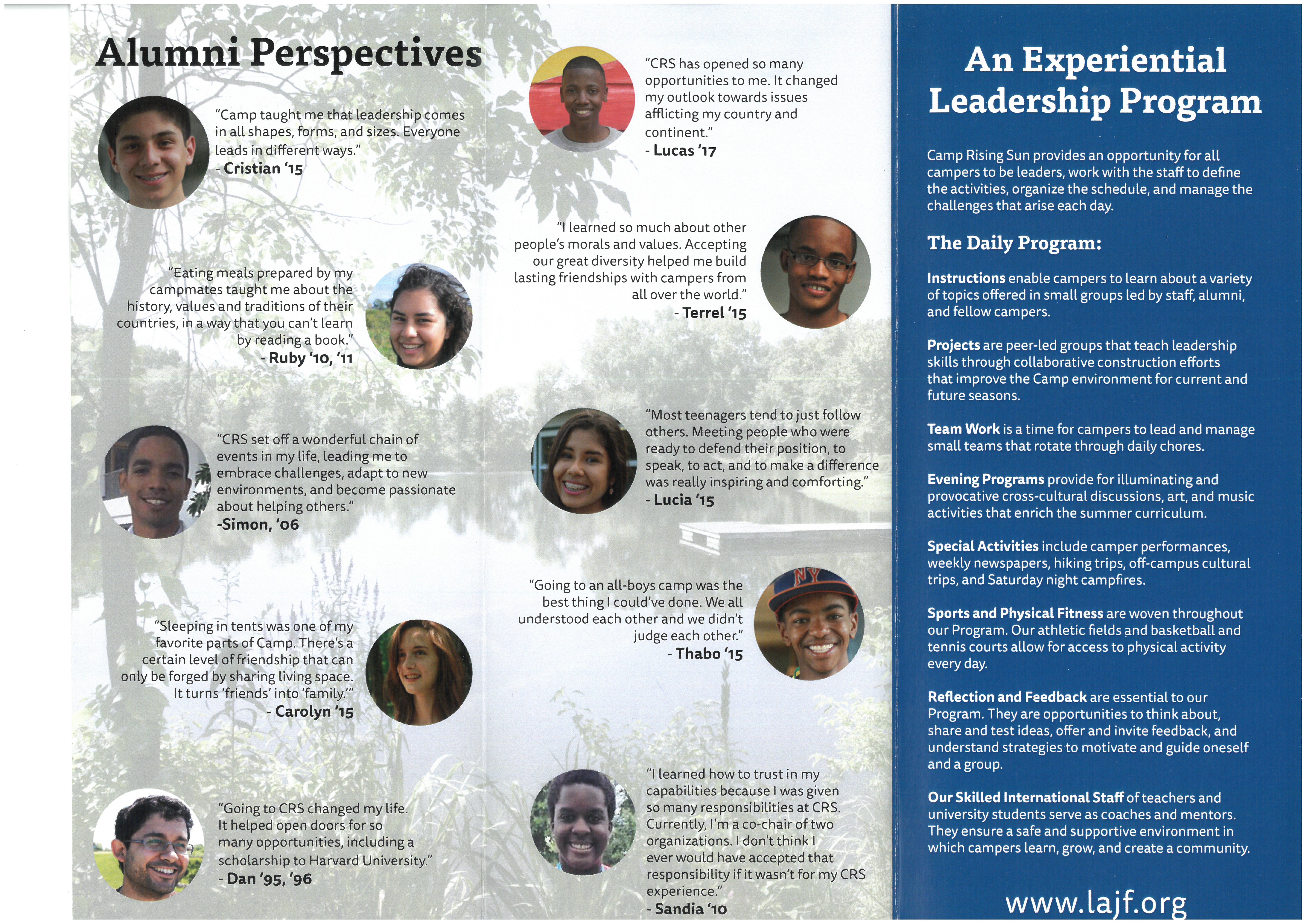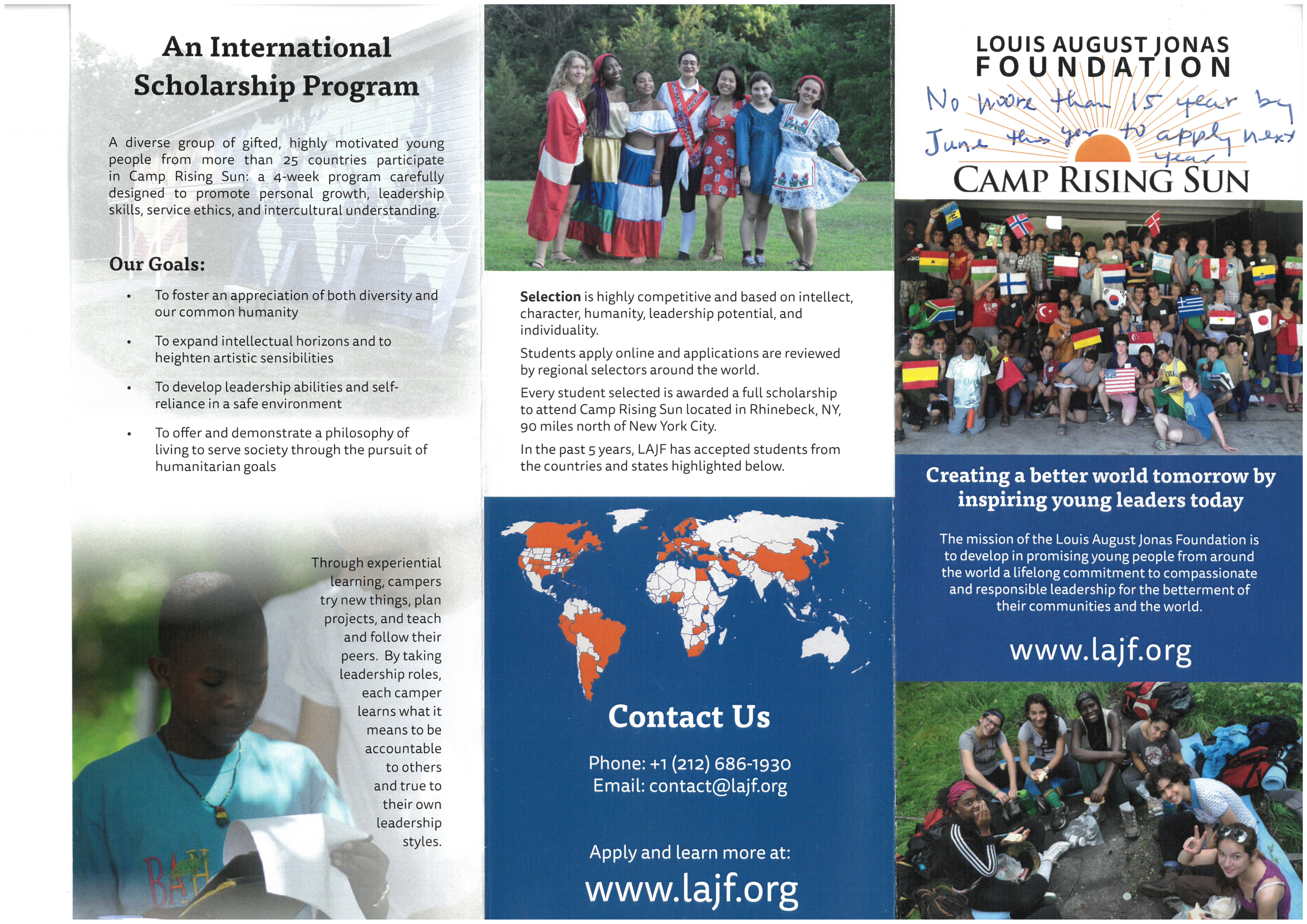 這是一個國際交流及培養leadership的夏令營,由美國企業家(Loius August Jonas) 全額獎學金贊助,只需要買往返美國機票。 有年齡限制,要在隔年6月時,未滿15歲;歡迎有興趣的同學踴躍報名參加。