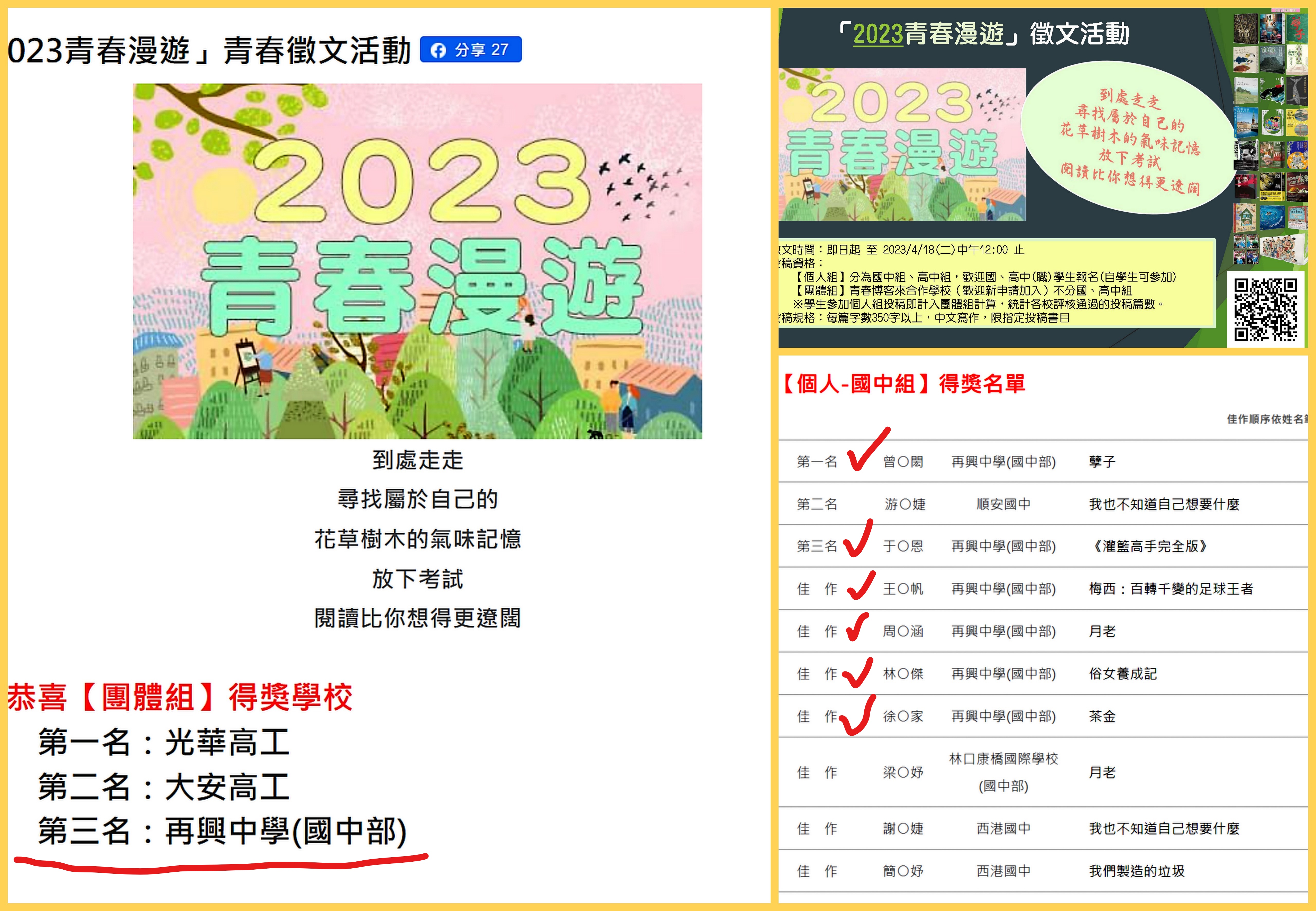 由青春博客來主辦「2023青春漫遊」青春徵文活動,投稿徵文時間於 2023/4/18中午12:00止,分團體組與高、國中個人組別競賽,本校同學在國文科老師們的鼓勵下踴躍投稿,5月初首先公布團體組成績(不分國、高中組),在全國數百所高國中參與下,本校國中部榮獲團體組第三名;緊接著於6月公布個人組成績,個人組除了前三名外另取佳作7名,本校榮獲國中組第一名、第三名及佳作4名。