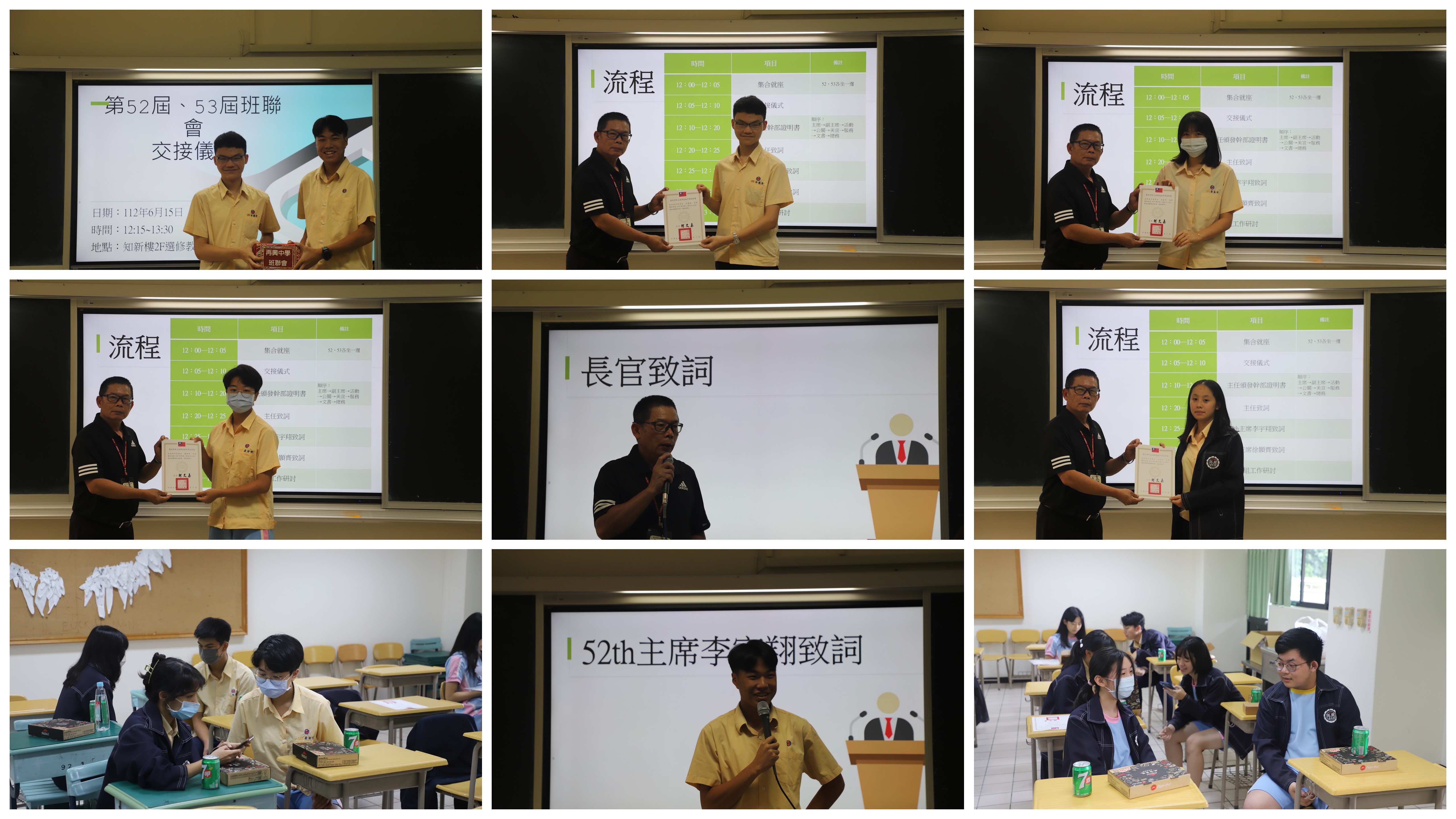 接著由第52屆班聯會及第53屆班聯會主席交接,新任第53屆班聯會主席徐顥齊同學(高一誠)由第52屆班聯會主席李宇翔同學(高二愛)手中接下主席神聖任務展開,再由雷主任一一頒發證書予全體第53屆班聯會成員。