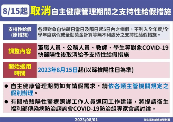 二、衛生福利部宣布自112年8月15日起COVID-19篩檢陽性輕症/無症狀者,取消各類對象自主健康管理期間之支持性給假措施,自主健康管理天數由10天調整為5天。