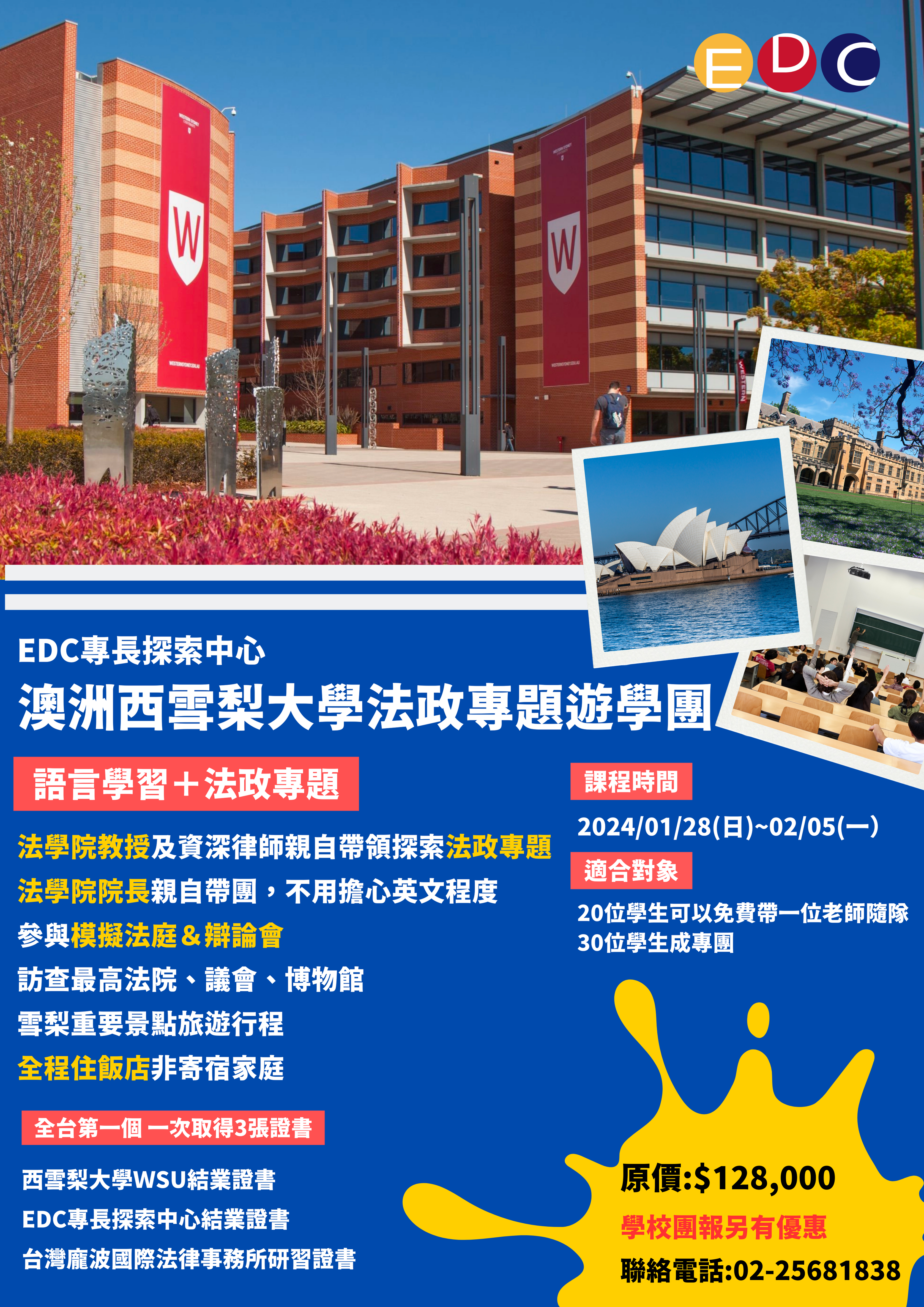 EDC於2024/01/28~02/05 全台首發澳洲九天西雪梨大學法政專題遊學團,