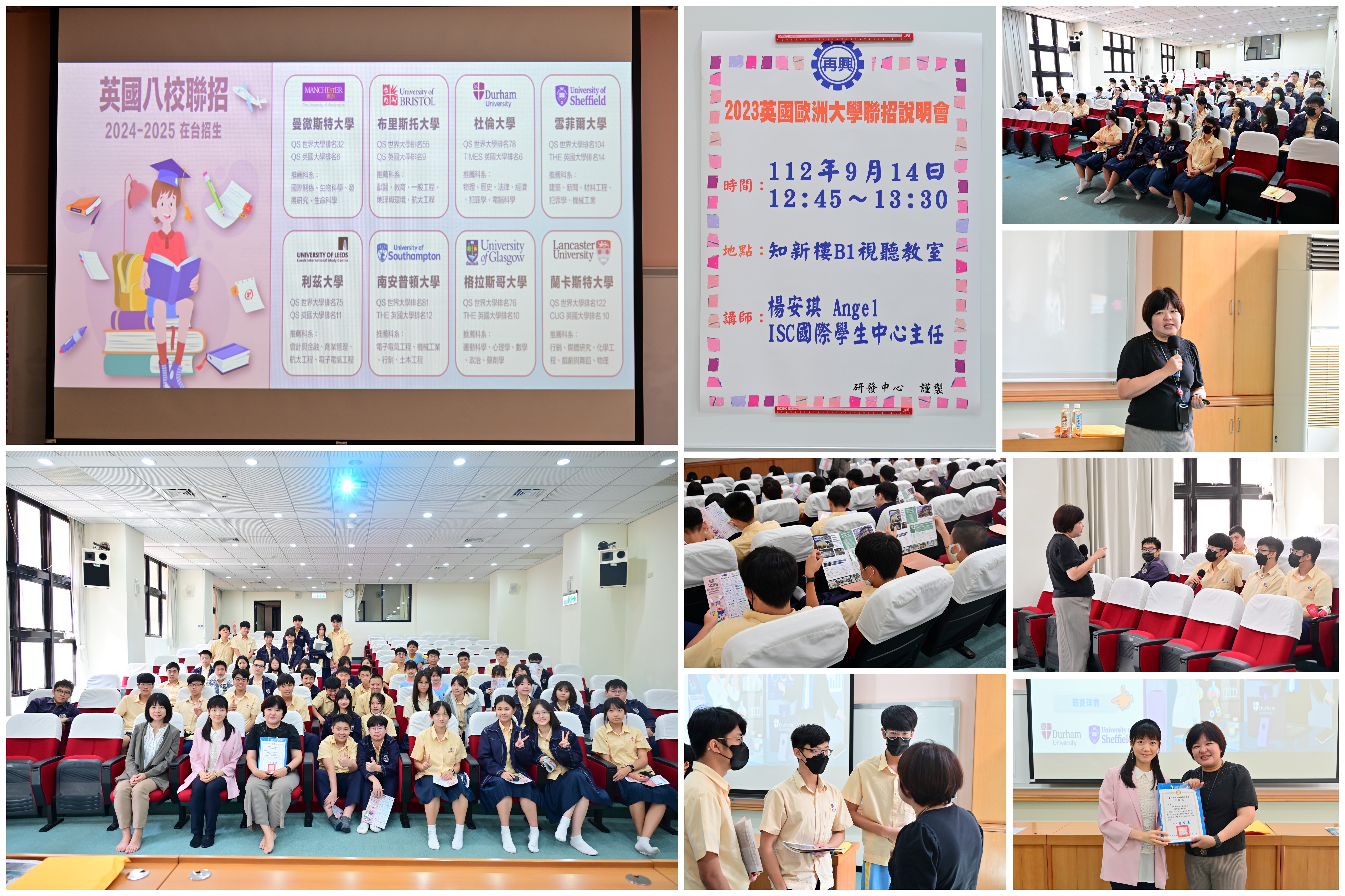 活動一開始,主任說明歐洲三年學制與國際預科課程一年的概念,接著提及各國大學申請差異與選擇,點出學生在評比欲就讀的學校時該考量的面向,並提醒學生須顧好三年學業成績,準備自傳與推薦信,考取托福或雅思英文檢定;至於大學是否採計SAT成績,則看地區要求決定。後半場主任介紹2024-2025英國八校聯合招生活動,帶大家認識幾所歐洲名校,包括英格蘭第三古老的杜倫大學、以卓越科研水平出名的雪菲爾大學、荷蘭四大頂尖理工大學聯盟之一的特文特大學等,鼓勵莘莘學子能提早確立方向並開始準備。說明會尾聲,許多學生踴躍至台前提問,主任皆詳細耐心的回答,並提供ISC國際學生中心的聯繫方式,歡迎學生多加利用。