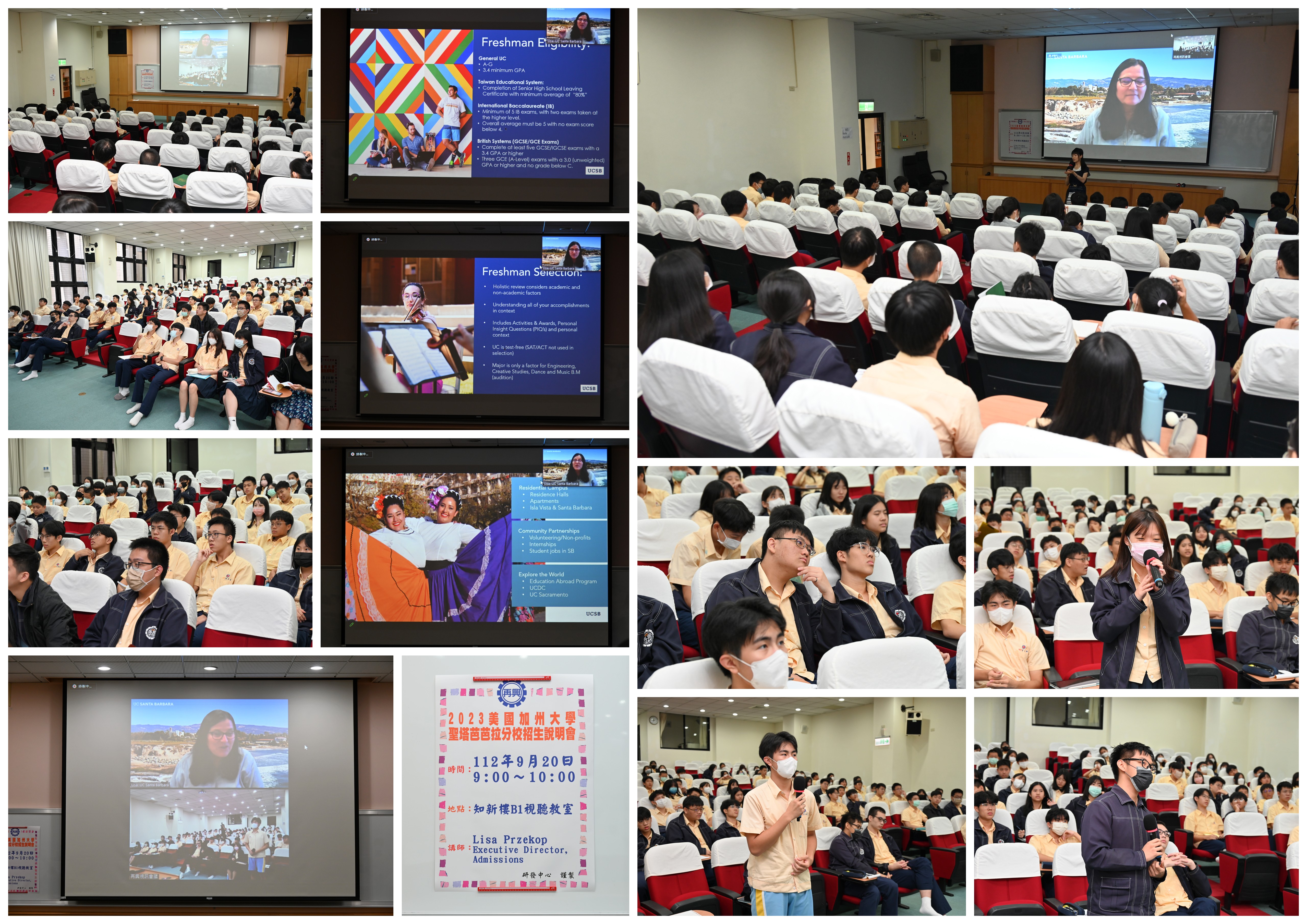 本校9月20日舉辦美國加州大學聖塔芭芭拉分校招生說明會,邀請國際招生部主任Lisa Przekop介紹校園與申請流程。本場說明會共有89位高中部學生參加,內容分為五個部分: 校園位置與環境、學校學術研究發展成果、學校軟硬體設備資源、入學條件與申請時程、學生提問時間。