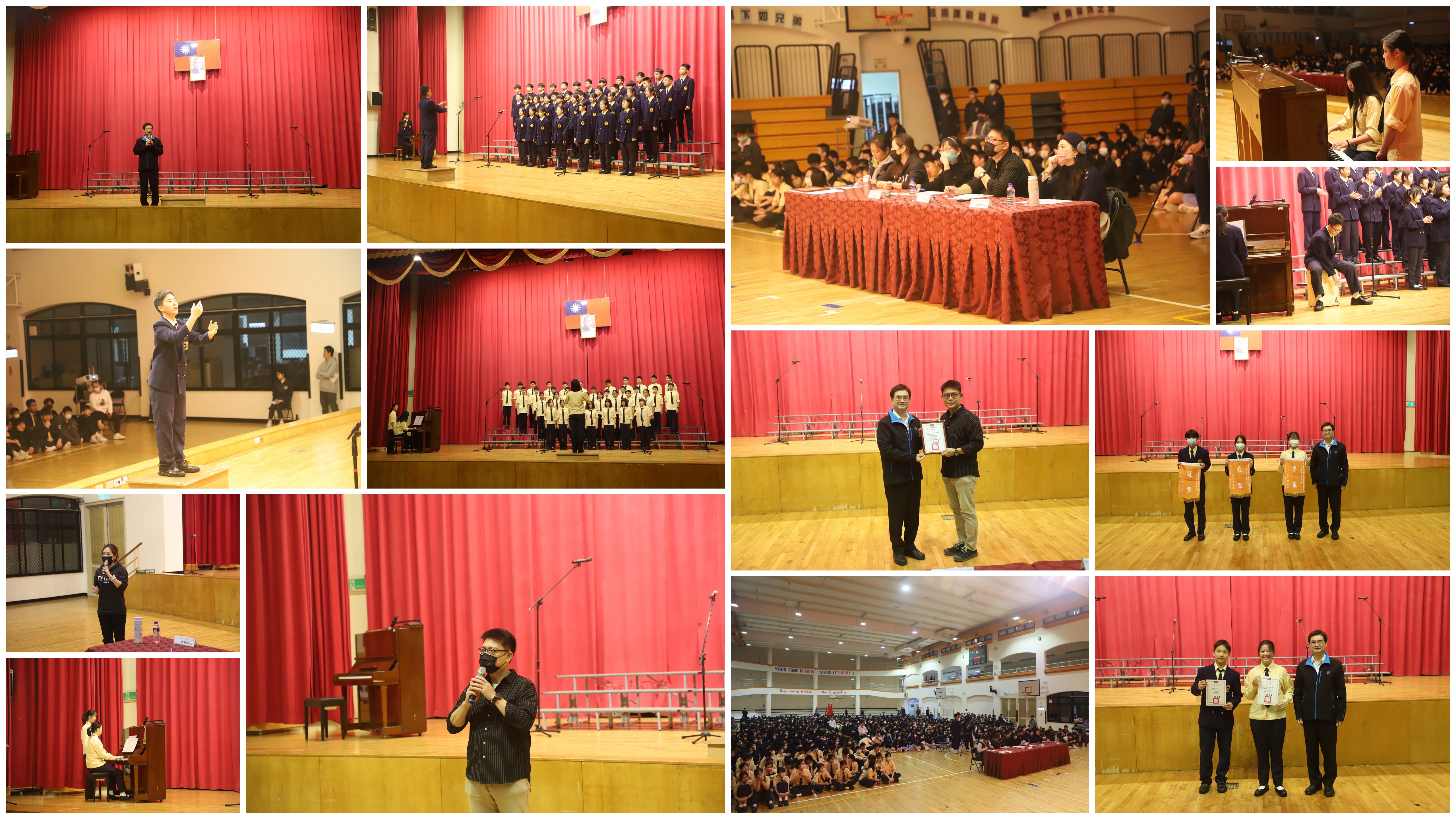 本校112學年度第1學期國中部八年級合唱比賽由學務處主辦,於112年12月6日國中部週會時間假本校知新樓B3體育館舉行。本項活動特別聘請專業合唱音樂教師林育誼老師、向芳誼主任以及廖珊珊老師擔任評審。八年級各班紛展平日音樂課練習成果,每班除全體同學上台參加比賽外,指揮及鋼琴伴奏均由各班同學擔任,完全不假他人之手;經激烈競爭後,成績名次如下: