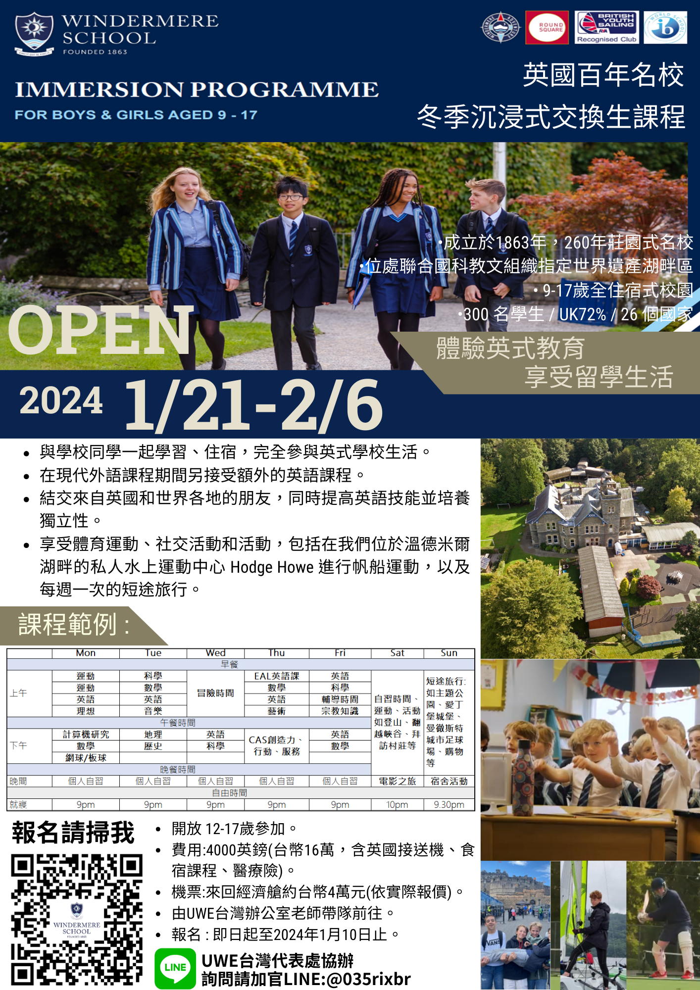 一、英國Windermere School溫德米爾學校於2024年1/21-2/6委託辦理『英國Windermere中學部冬季沉浸式交換生課程』