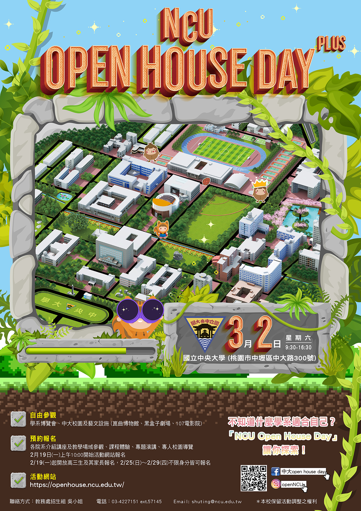 六、相關活動資訊請參閱活動網站:https://openhouse.ncu.edu.tw/。活動聯絡人:國立中央大學教務處招生組吳淑婷小姐,電話:03-4227151分機57145,E-mail:shuting@ncu.edu.tw。