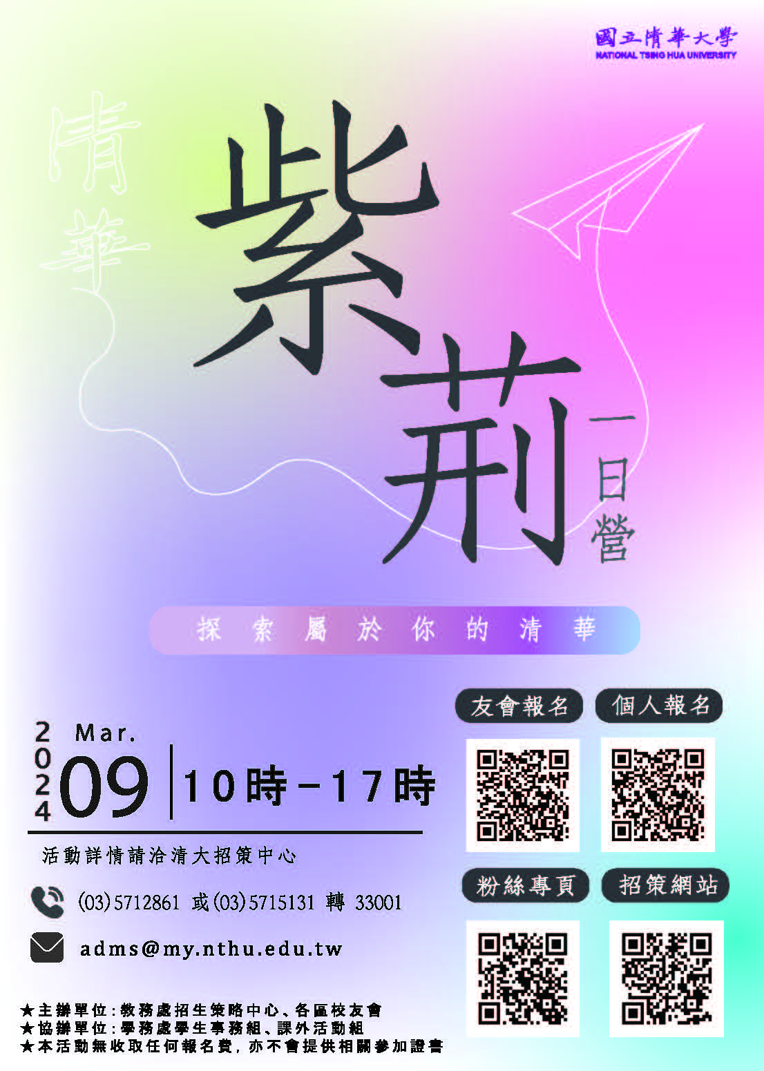 一、國立清華大學辦理113年3月9日清華紫荊一日營宣傳活動,詳細活動內容公告於國立清華大學招生策略中心網站(網址:https://adms.site.nthu.edu.tw/)。
