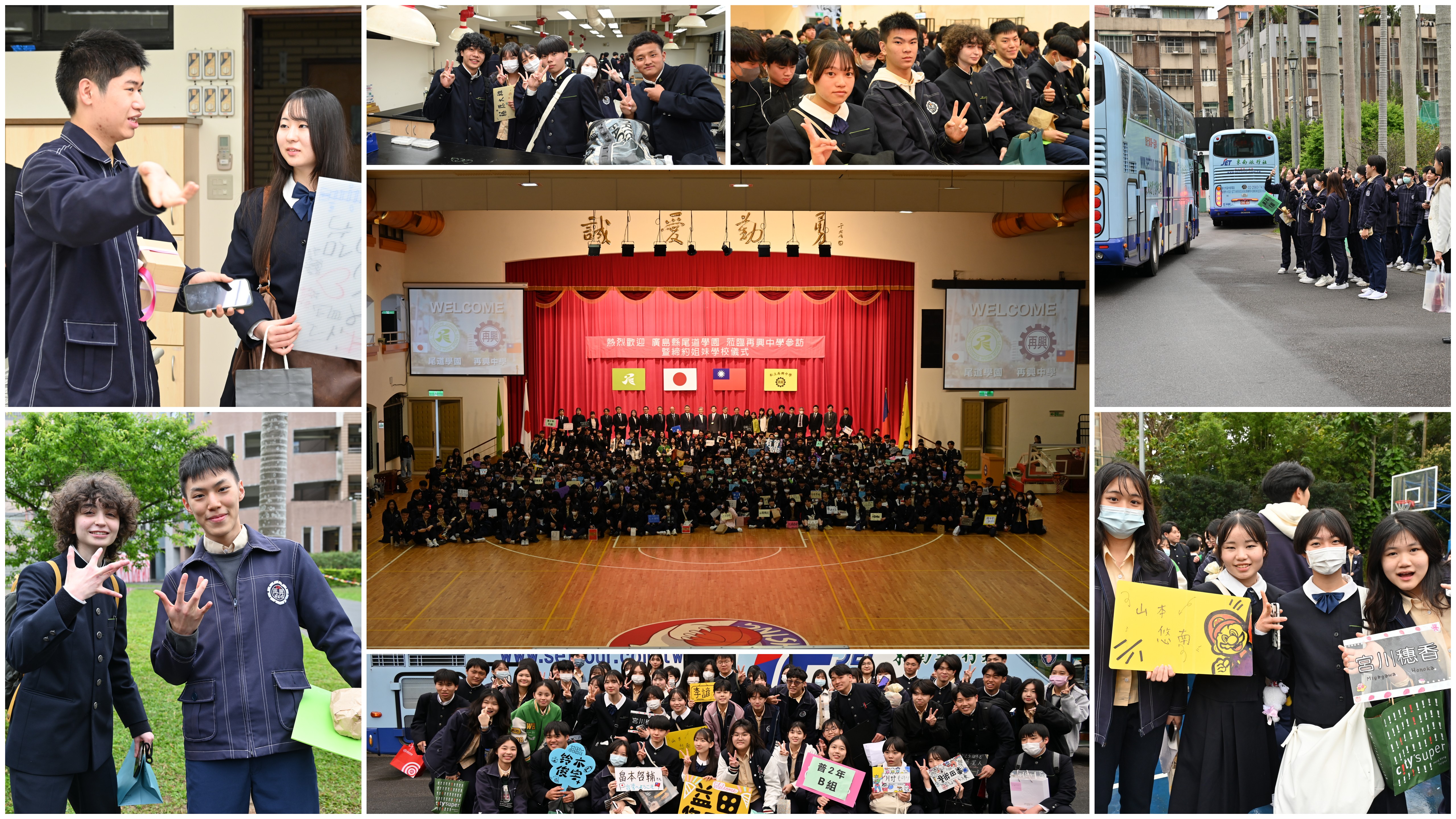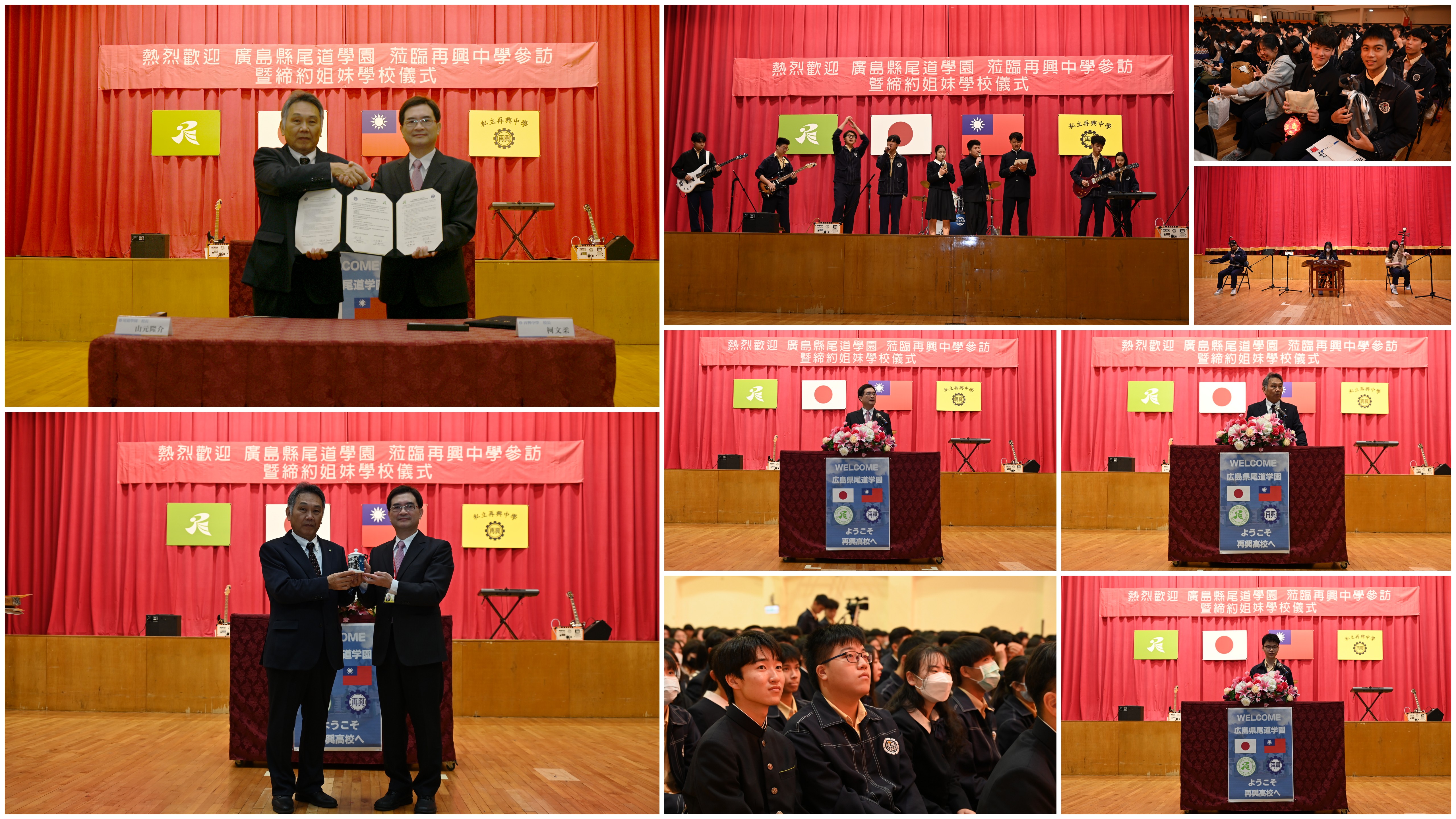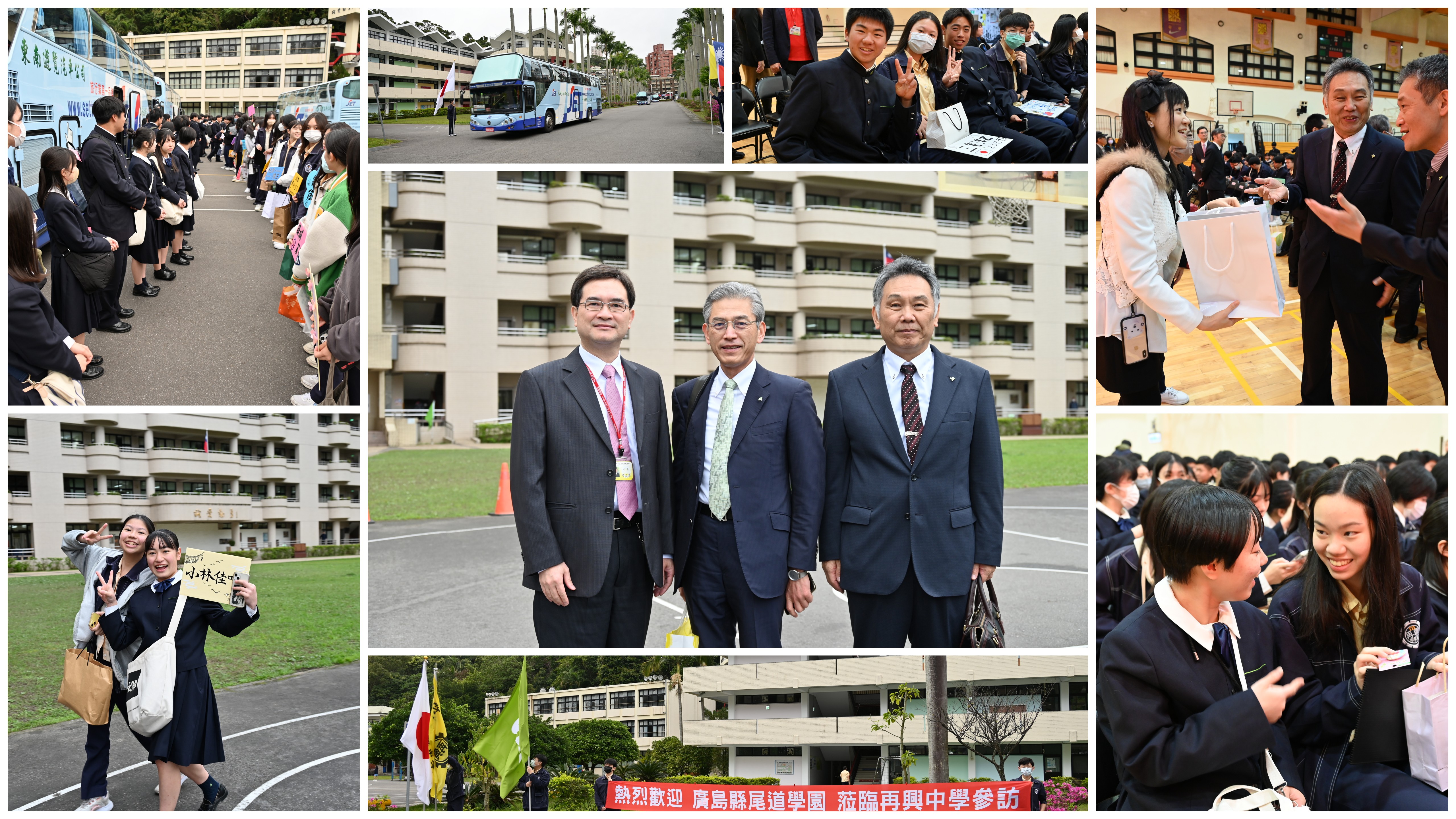 交流當天接待活動分為歡迎會及校園導覽二部分。歡迎會儀式流程首先由柯文柔校長與山元隆介校長進行兩校正式締約姐妹學校簽約儀式揭開序幕,簽約儀式完成後並互贈禮物。接下來再分別由柯文柔校長與山元隆介校長致詞,二位校長均共同表達對兩校交流情誼的深切期盼。然後由本校班聯會主席徐顥齊同學代表再興中學全體學生致詞,表達熱烈歡迎之意。隨後兩校416名學生互相交換禮物,展現對彼此的交流情誼。歡迎會後續由本校高一愛班李芷甯、高一勤班陳姵羽及國八孝班施韋均等三位同學以揚琴、琵琶、二胡這三種傳統樂器,共同彈奏日本著名動漫《灌籃高手》的片尾曲:「直到世界的盡頭(Sekai ga Owaru Made Wa)」,展現特別的樂曲風格,讓現場的所有嘉賓沉醉在美妙動人的音符之中。接著再由本校熱音社:高二仁班李家馨、李昊儒、陳彥宇,高一誠班:林宗澧,高一勤班:谷茂宇,高一勇班:廖孝太,國九義班:曾首憲七位同學與尾道學園普2A班:河村承瑛、髙地満天、田坂彩乃三位同學登場,繼續以不同的音樂風格演唱這首日本著名動漫名曲,兩校所有師長與學生紛紛跟隨音樂節拍一起哼唱或拍掌及搖動雙手,現場氣氛頓時更顯熱烈。熱鬧的表演節目結束後,兩校全體師長與學生於會場拍攝大合照,為此次交流活動留下一幅難忘而美好的畫面。