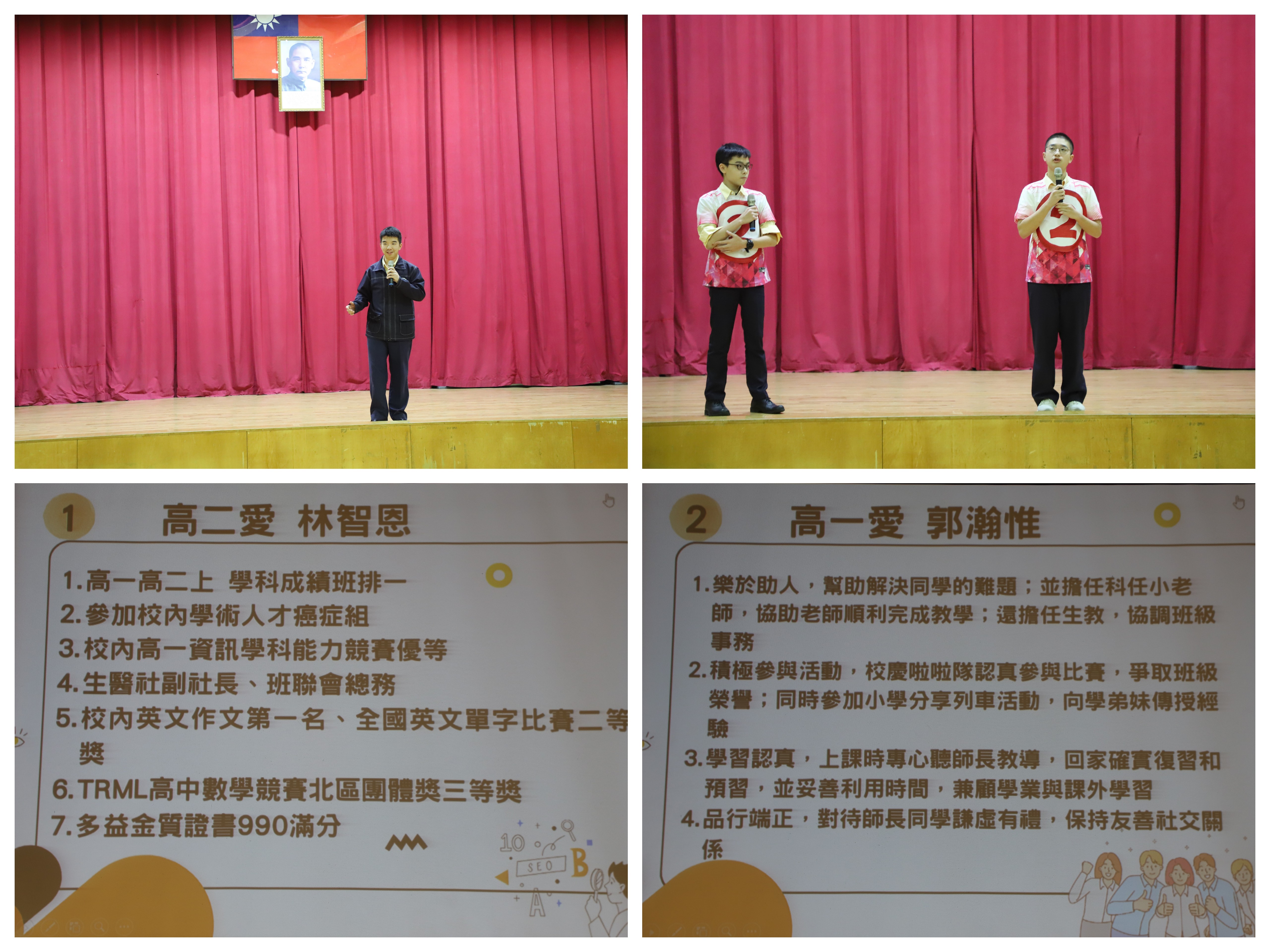 為配合臺北市教育局辦理臺北市112學年度全市優良學生選拔活動,本校高中部先於2月29日產生班級優良學生,各班級優良學生再依個人意願報名參加全校優良學生選舉後,3月13日(星期三)於週會時間辦理高中部候選人優良事蹟發表會,每位候選人在有限時間內展現個人特質,行銷自己。本學年計有2名同學參加競選。