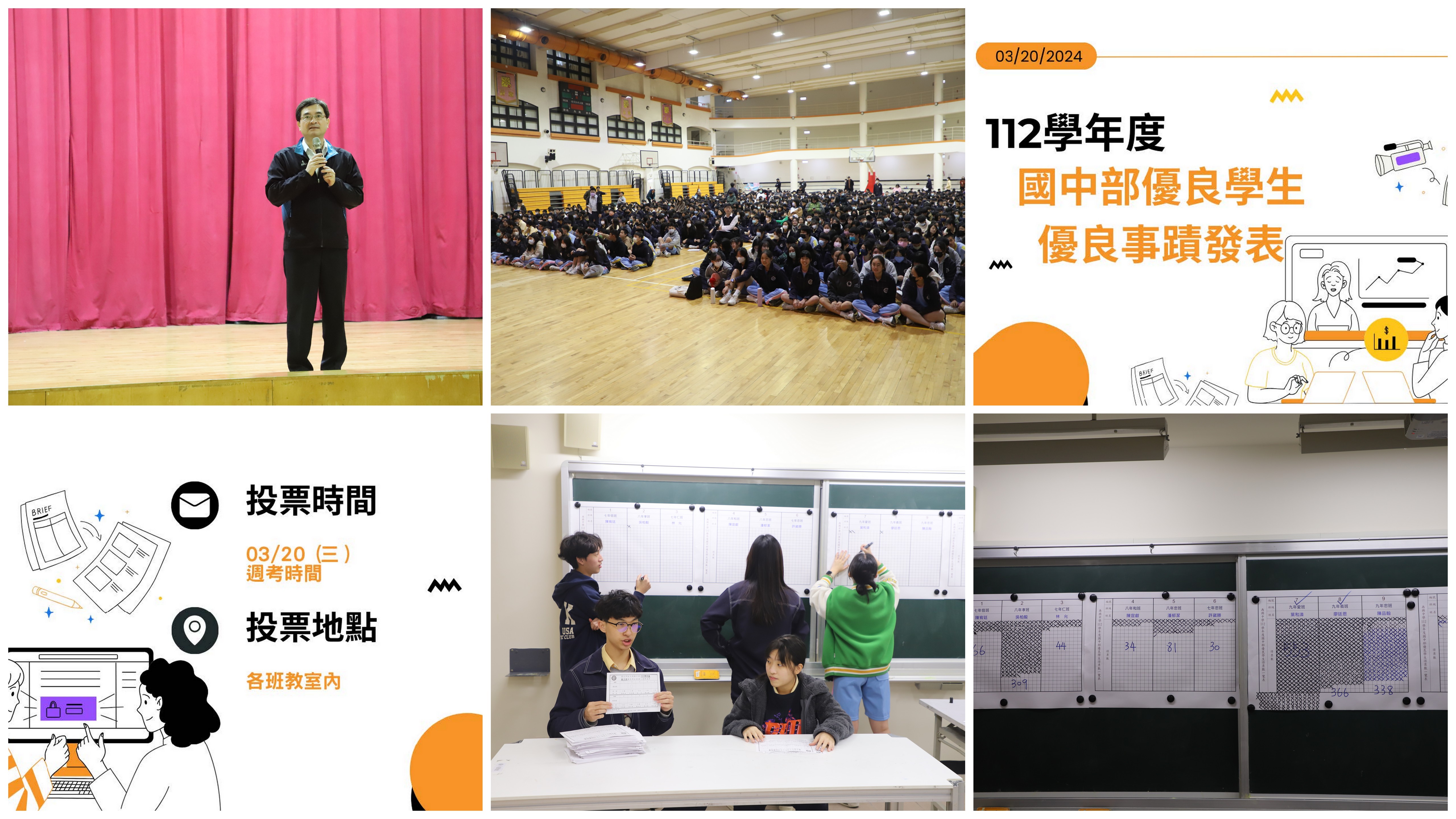 為配合臺北市教育局辦理臺北市112學年度全市優良學生選拔活動,本校國中部先於2月29日產生班級優良學生,各班級優良學生再依個人意願報名參加全校優良學生競選。學務處於3月20日(星期三)週會時間辦理國中部候選人優良事蹟發表會,每位候選人發揮行銷自我的創意,展現個人特質。本學年共有10名同學參加競選,名單如下: