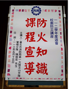 教育部推動校園防災政策,目標係從思維概念著手,透過教育宣導,使防災觀念從小扎根,建立正確的認知,培養正面積極的災害管理態度,強化災害應變能力。本校每學期透過定期辦理防災知識宣導、逃生演練、滅火器使用與CPR+AED要領示範,強化師生情境思考、危機處理與災害心理,落實防災教育。