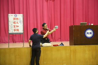 講師提醒同學們,安全是自己的責任,火災瞬息萬變,平時要有危機意識,多瞭解消防安全常識及逃生避難方法。平時應避免在室內堆放過多雜物影響逃生、電器產品周邊不放置可燃物、電線不綑綁、使用延長線不超載、不潮濕汙損擦頭。進入陌生場所時,應留意安全門、梯位置,熟悉逃生路徑,並注意有無兩個不同逃生方向出口。認識平時居住環境或辦公處所之消防設施及逃生避難設備,事前擬妥逃生避難計畫並預習,狀況發生時,便能從容應付,順利逃生。最後,講師邀請同學上台示範CPR與AED的操作步驟,平時多一分演練,緊急時就能搶救一個寶貴的生命。